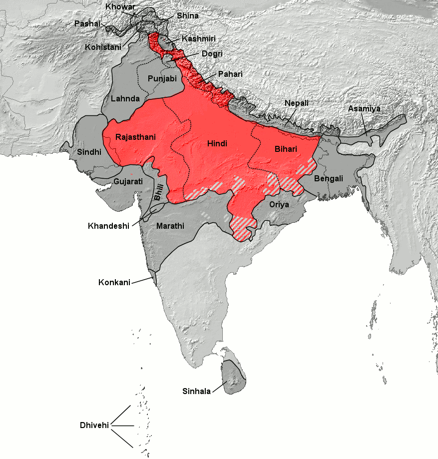 - 산스크리트어는 고대 인도에서 사용되었으며, 남아시아 대부분 지역에서 공용어 역할을 했다.[29][30][31] 기원후 1세기에는 승려, 종교 순례자, 상인들을 통해 동남아시아와 중앙아시아에서도 채택되었다.[32][33][34] 불교의 확산으로 인도 각지, 동남아시아, 동아시아로 퍼졌다. 팔리어는 상좌부 불교가 성행한 지역(스리랑카, 동남아시아 서부)에서 가톨릭의 라틴어와 같은 기능을 했다.