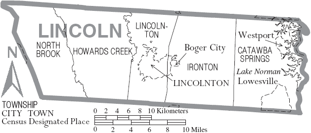 링컨군 지도 (노스캐롤라이나주), 시 및 타운십 표기