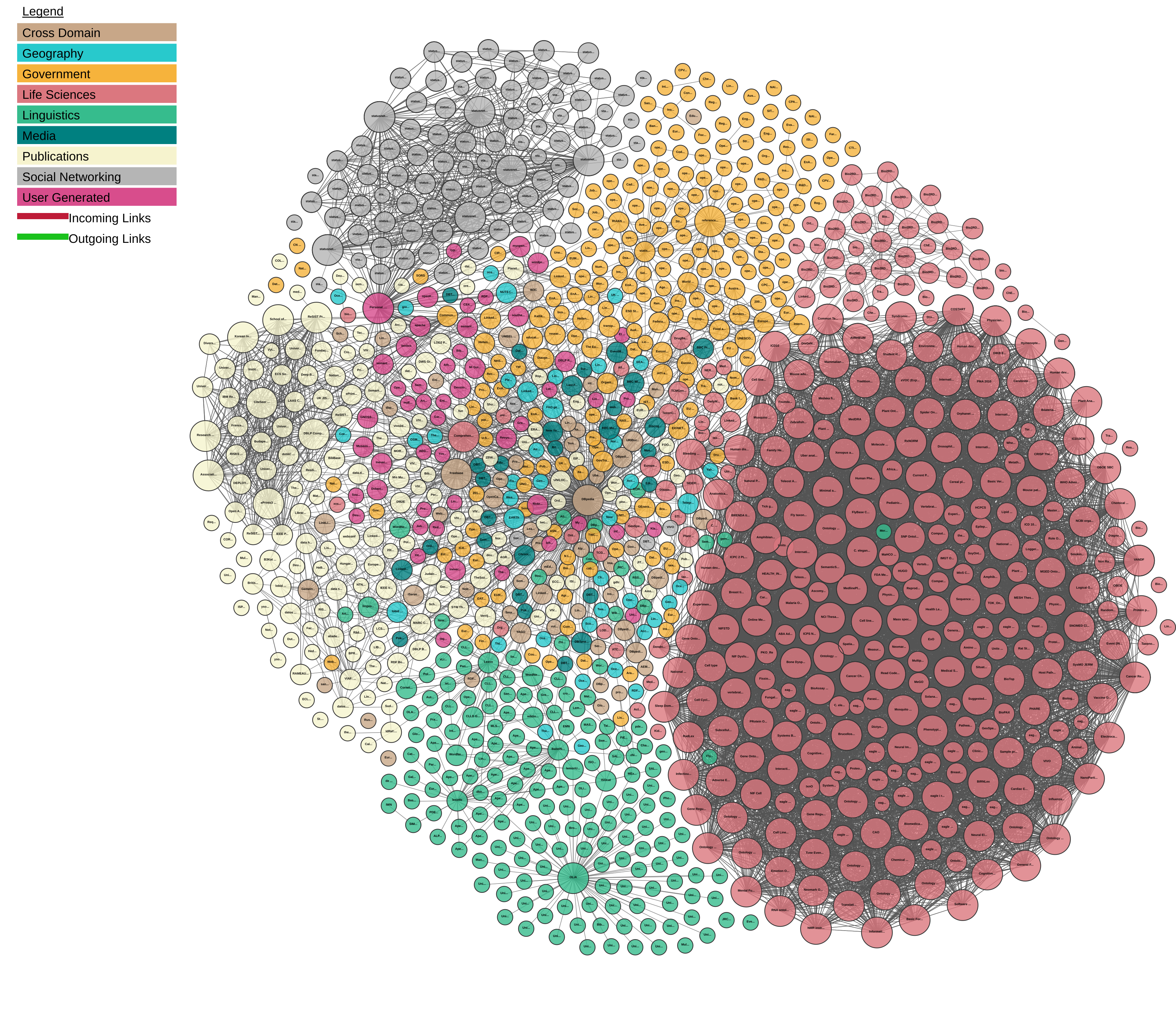 - DBpedia - 위키백과에서 추출한 데이터를 포함하는 데이터 세트이다. 11개 언어로 된 초록을 포함하여 10억 개의 시맨틱 트리플로 설명되는 약 340만 개의 개념이 포함되어 있다.