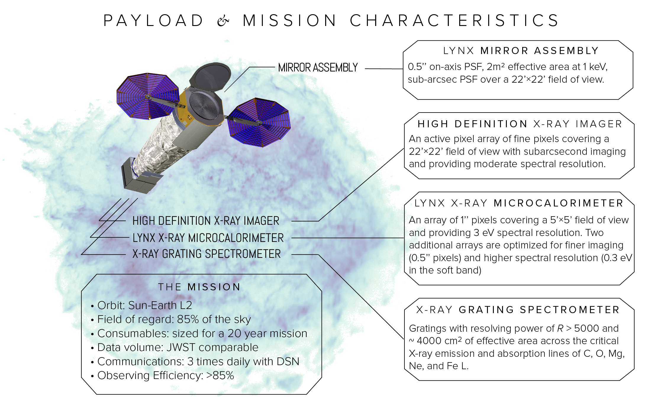 | 장비 | Lynx X-ray Mirror Assembly (LMA) High Definition X-ray Imager (HDXI) Lynx X-ray Microcalorimeter (LXM) X-ray Grating Spectrometer (XGS) |