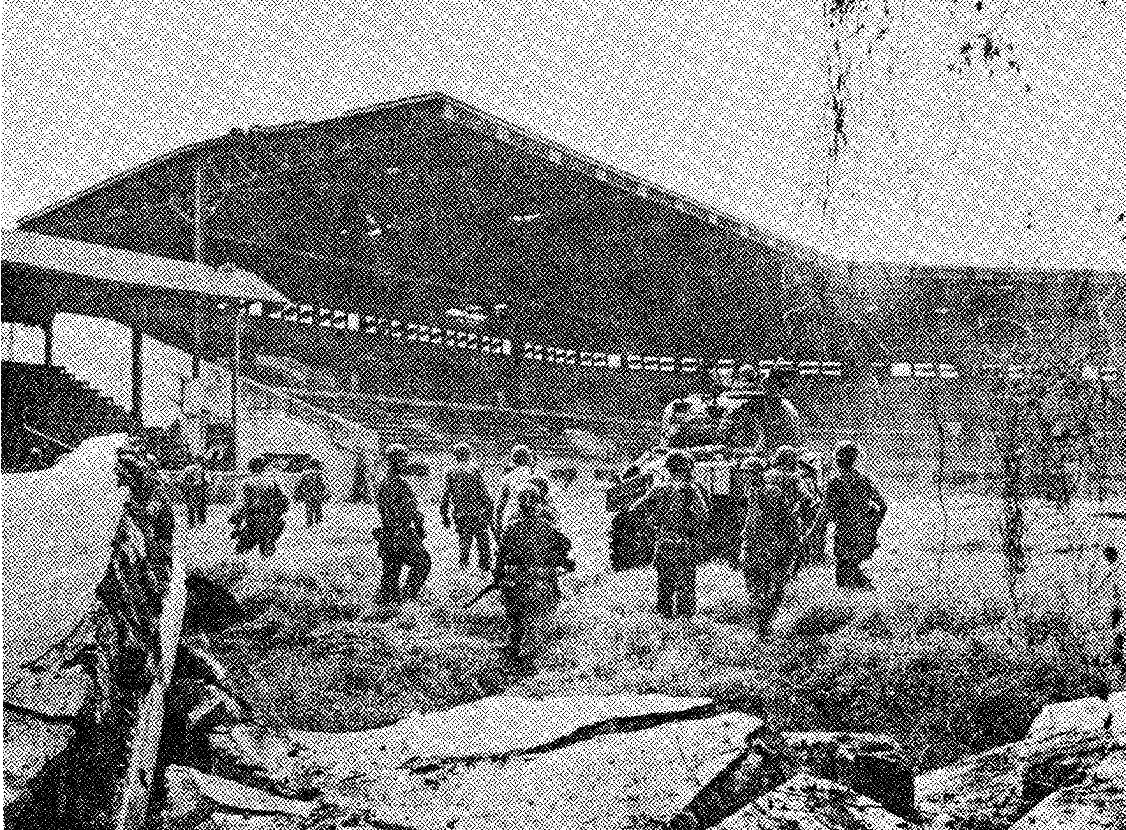 USAFFE 게릴라 장교인 마누엘 콜라이코(Manuel Colayco) 대위는 동료인 디오스다도 귀팅코(Diosdado Guytingco) 중위와 함께 미군 제1기병사단을 산토 토마스 정문으로 안내한 후 도시 해방 작전 중 연합군 사상자가 되었다.[7] 일본군의 총탄에 맞은 콜라이코는 야전병원이 된 레가르다 초등학교에서 7일 후 사망했다. 밤 9시, "배틀린 베이직(Battlin' Basic)"이 이끄는 제44전차대대의 전차 5대가 구내로 진입했다.[7]