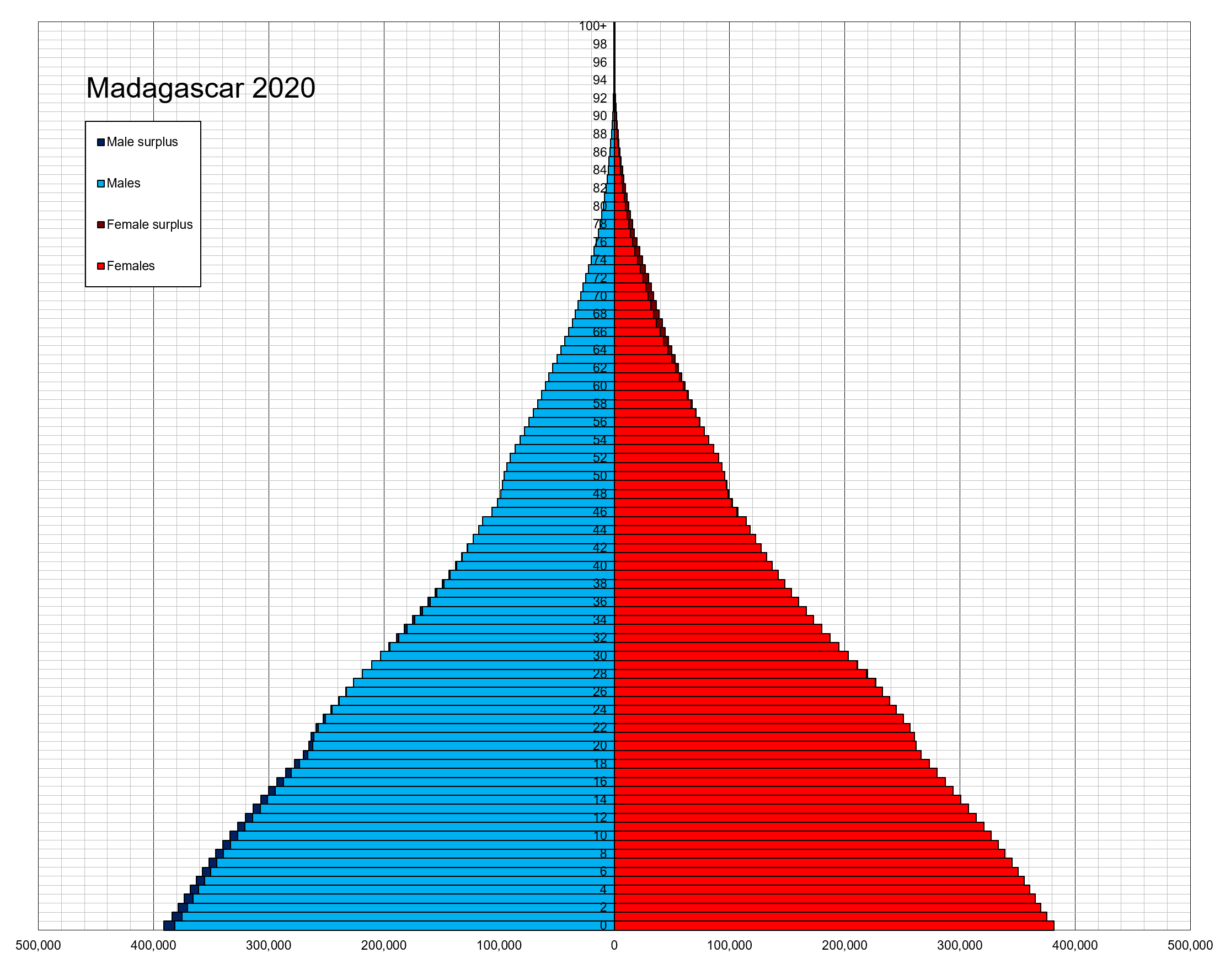 유엔 자료에 따르면, 1950년 마다가스카르의 총 인구는 약 408만 명이었다. 2010년에는 총 인구가 약 2,071만 명으로 증가했으며, 연령별로는 15세 미만 인구가 43.1%, 15세에서 64세 사이가 53.8%, 65세 이상이 3.1%를 차지했다.[1]