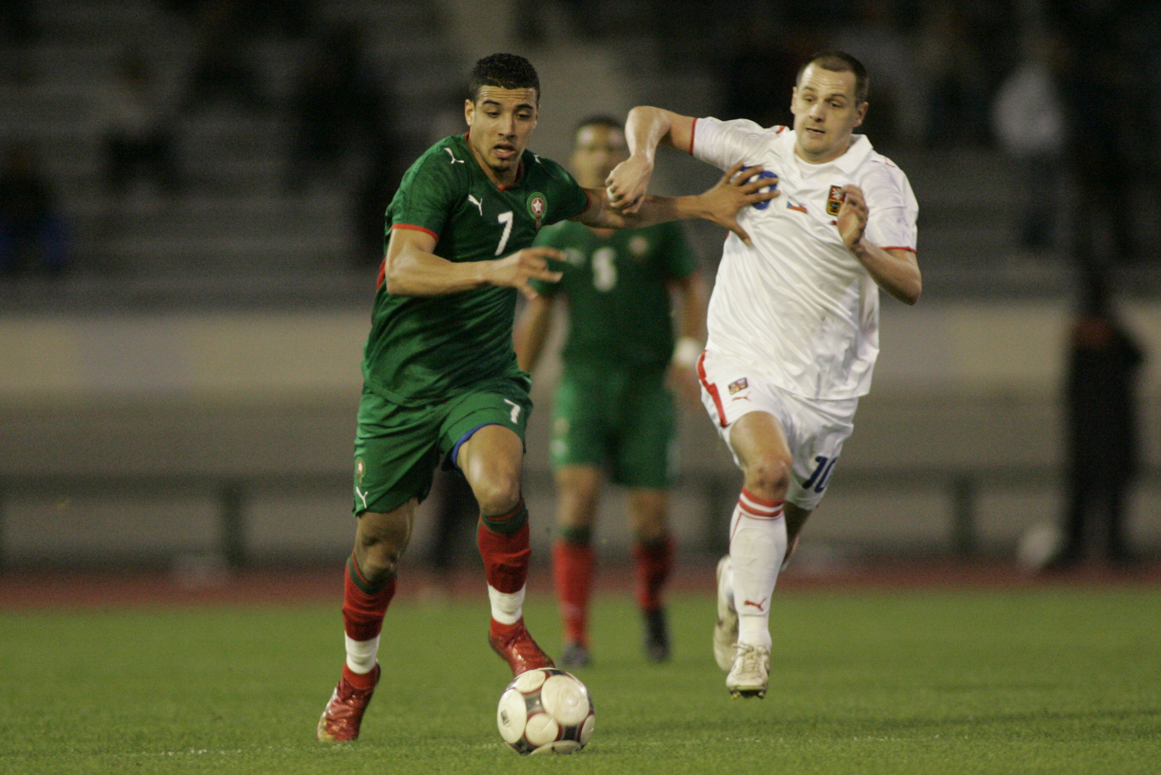 마테요프스키, 2009년 2월 친선 경기에서 모로코의 나빌 디라르에게 도전하고 있다.