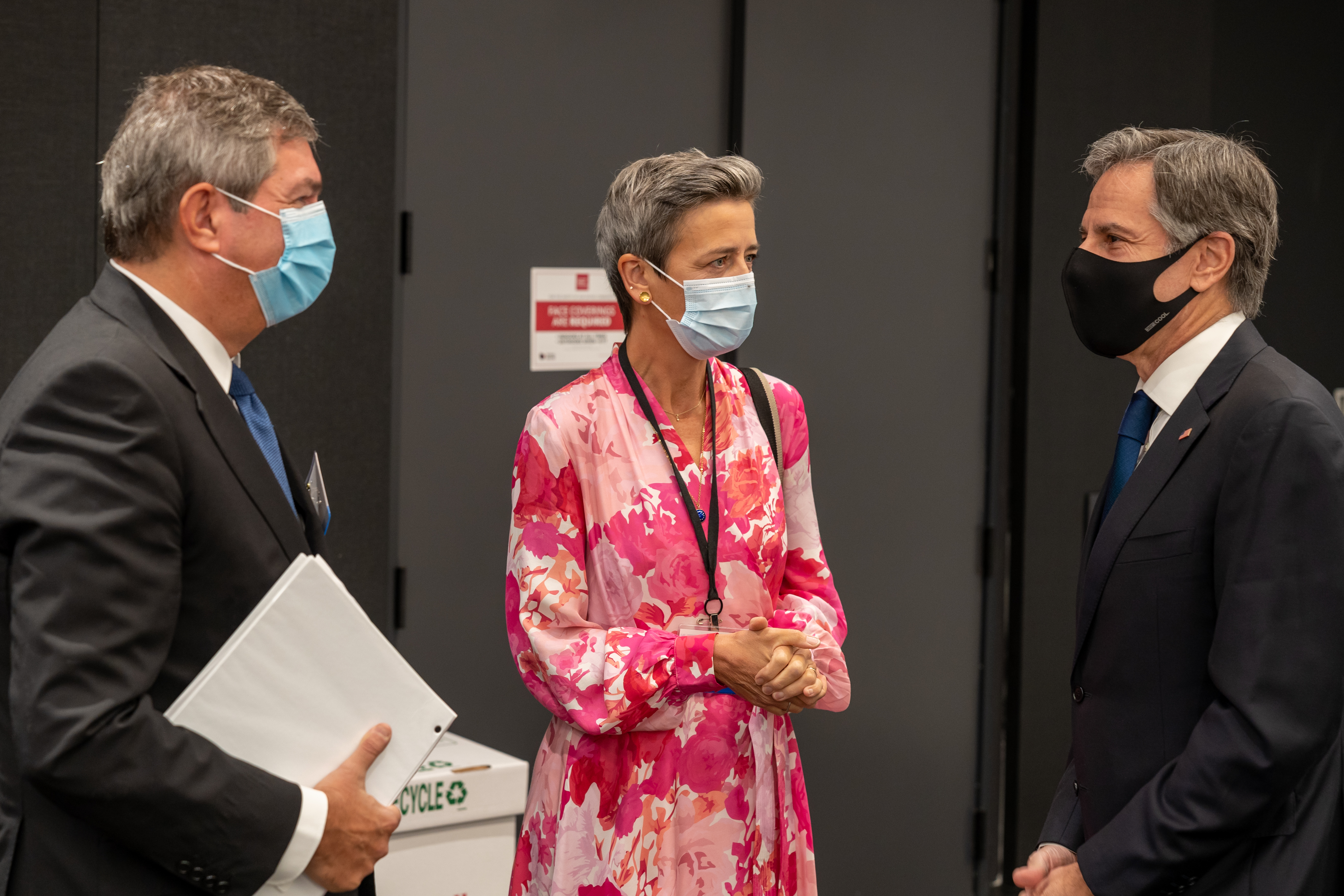 베스타게르, 토니 블링컨 및 스타브로스 람브리니디스와 함께, 2021년 제1차 미국-EU 무역기술위원회(TTC) 회의 전 모습