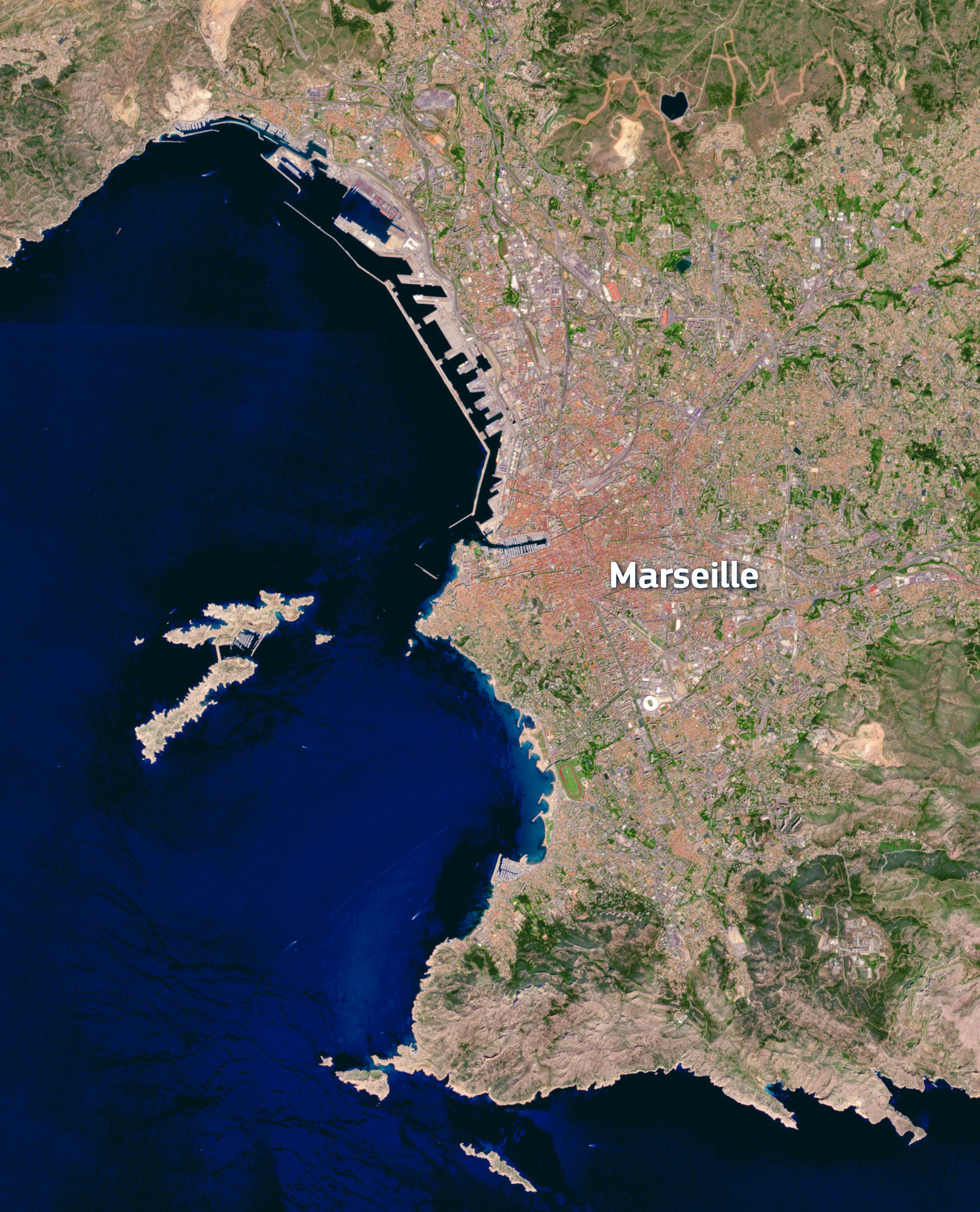마르세유의 역사적인 지역은 서쪽의 바다와 산지, 남쪽의 카르스트 지대, 블뢰 코트와 레스탁, 그리고 북쪽의 에투알 산맥과 가를라방 산맥에 둘러싸여 원형 경기장과 같은 형태를 하고 있다.