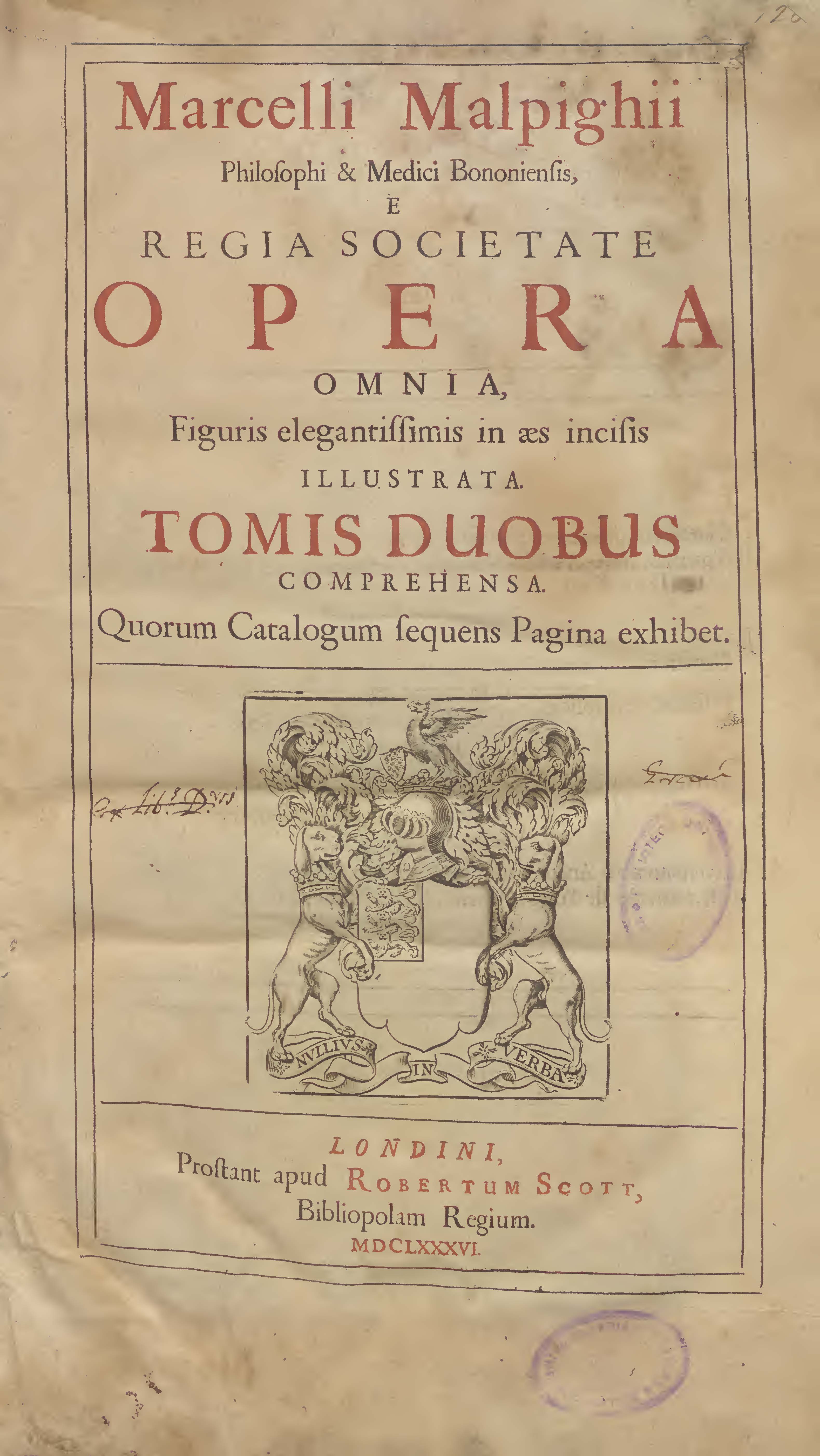1696년 런던에서 출판된 ''Opera Posthuma''에 실린 마르첼로 말피기의 초상화