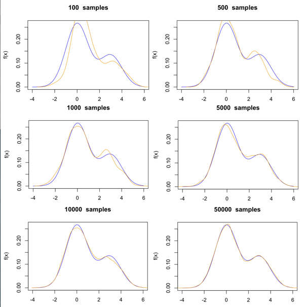 - 슬라이스 샘플링: 확률 밀도 함수의 그래프 아래 영역에서 균일하게 표본을 추출하면 목표 분포를 따르는 표본을 얻을 수 있다는 원리에 기반한다. 수직 방향으로 균일 표본을 추출하고, 해당 수직 위치에서 정의되는 수평 '슬라이스(slice)' 내에서 다시 표본을 추출하는 과정을 번갈아 수행한다.