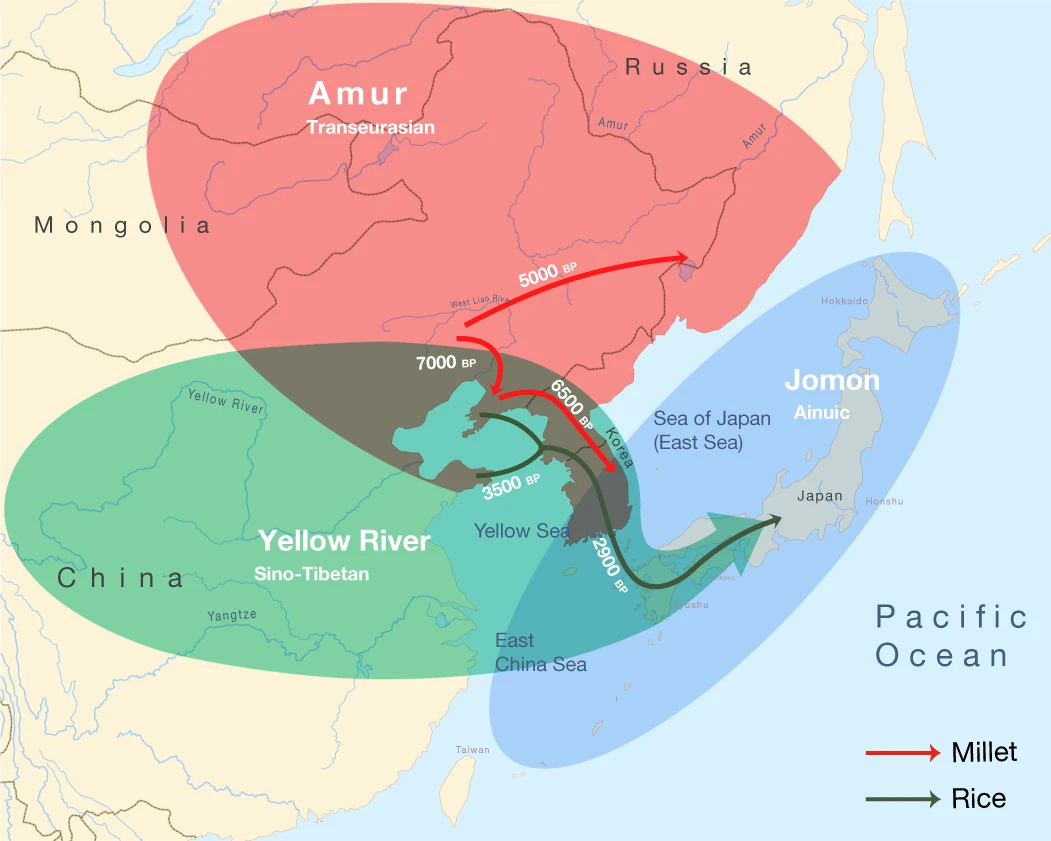 기원전 3300년경 산둥반도나 랴오둥반도에서 벼 농사, 밀, 보리 농경이 한반도에 전파되어 무문토기 문화가 성립되었고,[8][9] 기원전 3천 년경 이 문화가 규슈에 전해져 야요이 문화가 성립되고 일본 열도에 일류어족이 퍼져나갔다고 본다.[8][9]