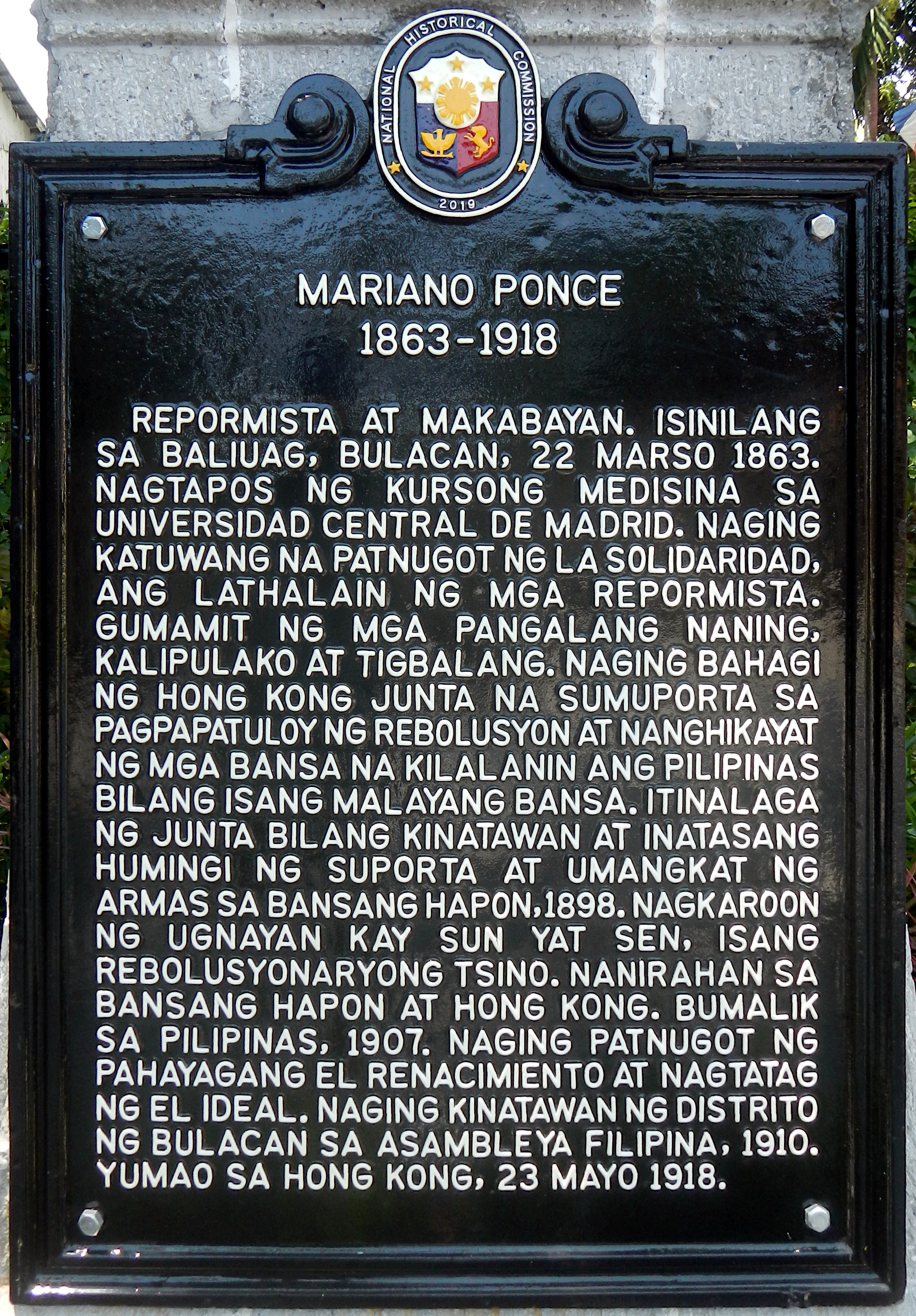 마리아노 폰세는 필리핀의 혁명가, 외교관, 의사, 작가, 정치인이다. 불라칸주에서 태어나 산토 토마스 대학교에서 의학을 공부한 후 스페인으로 건너가 마드리드 콤플루텐세 대학교에서 유학했다. 그는 스페인에서 필리핀 개혁 운동인 프로파간다 운동에 참여하여, 기관지 라 솔리다리다드의 공동 설립자이자 문학부장으로 활동했다. 필리핀 혁명 당시에는 일본에 파견되어 무기 조달을 시도했으나 실패했고, 이후 필리핀 의회 의원을 역임했다.