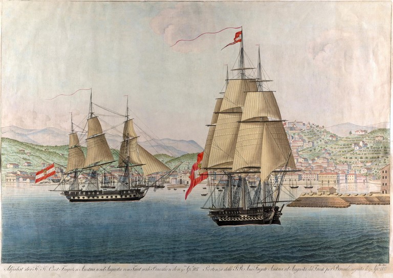 마리아 레오폴디네를 브라질로 데려간 두 척의 배 '오스트리아'와 '아우구스타'를 묘사한 채색 조각, 트리에스테에서 출항, 조반니 파시 작품