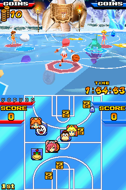 경기는 각 팀당 세 명의 선수로 구성되며, 주로 ''마리오'' 및 기타 닌텐도 게임의 캐릭터와 스퀘어 에닉스(Square Enix)의 ''파이널 판타지'' 시리즈의 캐릭터가 등장한다. 경기 중에는 닌텐도 DS 터치 컨트롤이 움직임을 제외한 모든 동작에 사용되며, 움직임은 방향 패드로 처리할 수 있다. 플레이어는 터치 스크린을 통해 직접 제어할 수도 있다. DS의 상단 화면에는 3D로 게임이 표시되고, 하단 화면에는 전체 코트의 오버헤드 뷰가 표시된다. 드리블(dribble)은 자동으로 수행되지만 터치 스크린을 사용하여 적극적으로 드리블하지 않으면 더 느리다.
