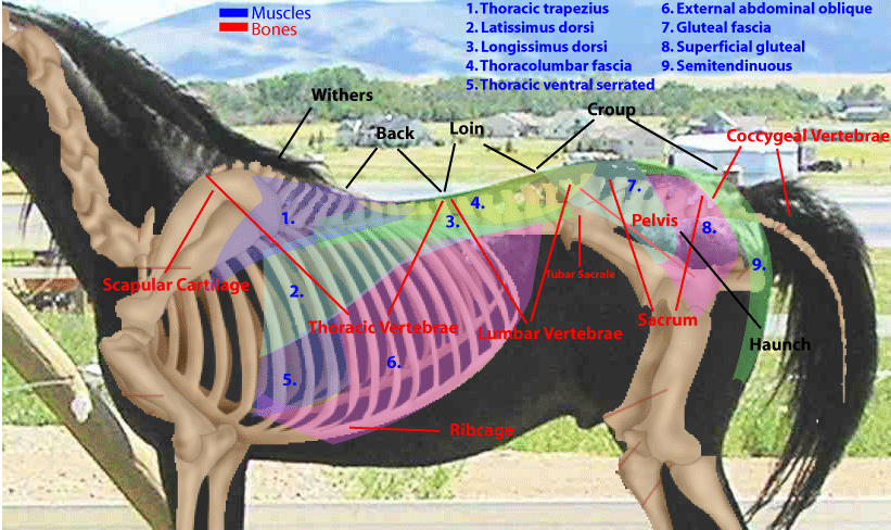 말의 등뼈는 근육, 세 개의 인대, 복부 근육에 의해 지지된다. 척추근(Spinalis Dorsi)은 네 번째 경추에서 시작하여 승모근(Trapezius)의 흉부 아래에 삽입된다. 최장근(Longissimus dorsi)은 마지막 네 개의 경추에서 시작하여 척추를 따라가 결국 엉덩뼈와 천골에 삽입된다. 이 근육은 척추를 수축시키고 머리와 목을 들어 올리고 지지하며, 뒷발로 차기, 점프 및 회전에 사용되는 주요 근육이다. 이 근육은 몸에서 가장 길고 강하며 기수가 앉는 근육이다. 늑간근은 갈비뼈 사이의 공간에서 시작하여 호흡을 돕는다. 외부 및 내부 복사근은 갈비뼈와 골반에 부착되어 내부 장기를 지지한다. 극상 인대는 목덜미 인대의 연장선으로, 폴에서 시작하여 기갑에 삽입된다. 극상 인대는 나머지 흉추와 요추의 상단에 부착된다. 이 두 개의 인대는 결합하여 말의 윗선을 따라 연결을 제공하여 몸의 탄력적인 움직임을 돕는다.