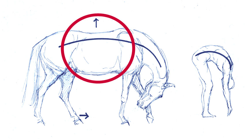 말의 등 모양은 크게 다를 수 있다. 말의 목덜미, 등, 허리의 윗부분 곡선을 "등선", 팔꿈치에서 옆구리까지의 복부선을 "밑선"이라고 한다. 이상적인 형태는 비교적 짧은 등선에 긴 밑선을 가지는 것이다. 밑선은 복부 근육이 있는 곳으로, 사람처럼 컨디션이 좋으면 등에 큰 지지력을 제공한다. 등선은 길이와 곡률이 다양하며, 이 둘은 약간의 관계가 있다. 말을 탈 때 말의 등은 인대, 근육, 힘줄의 긴장과 강도, 훈련 및 신체적 컨디션에 따라 움직임에 따라 뻣뻣하거나 이완될 수 있다.