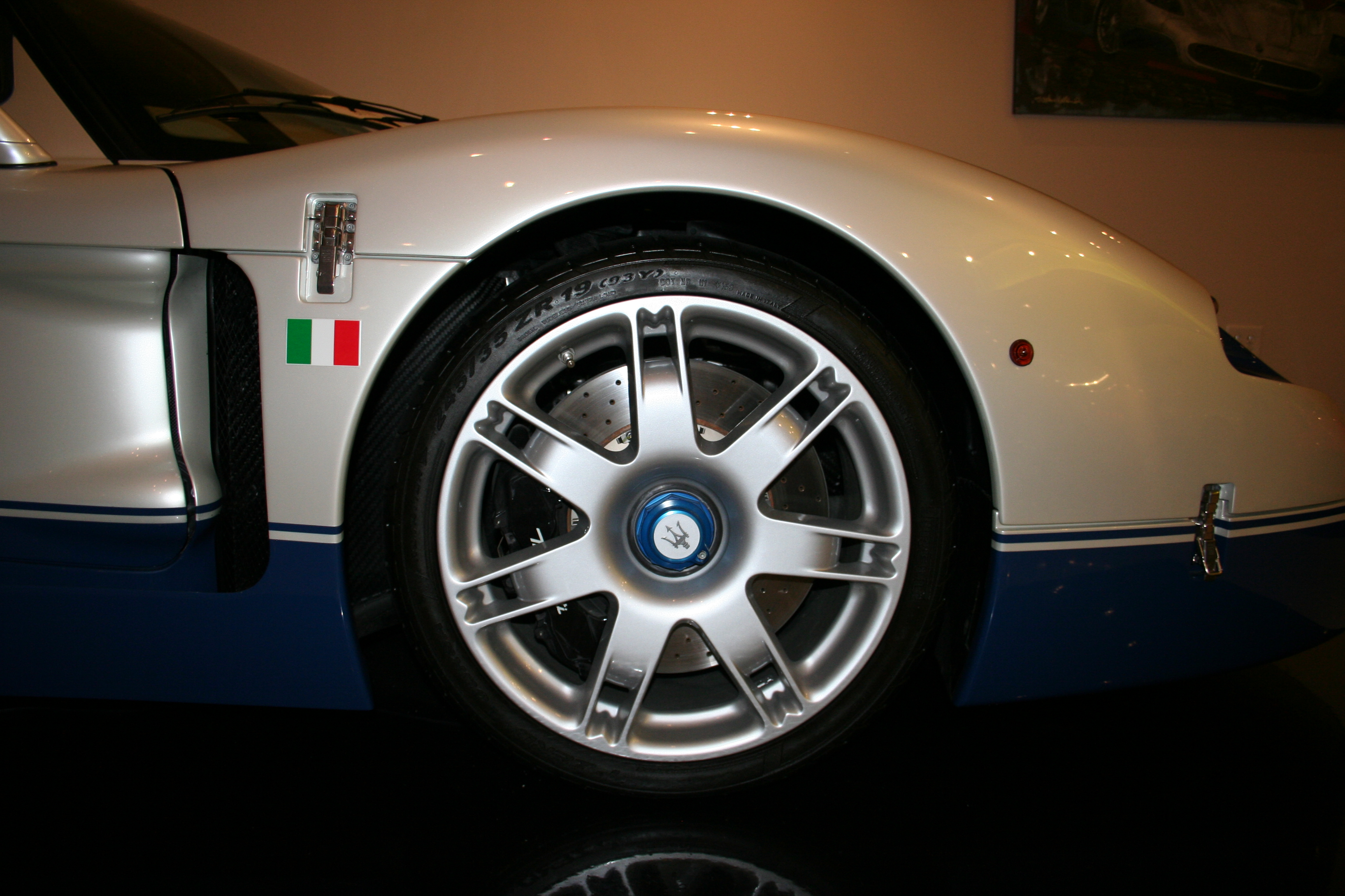 MC12는 480mm (19인치) 휠을 장착하고 있으며, 전면 휠 폭은 약 22.86cm, 후면 휠 폭은 약 33.02cm이다. 타이어는 피렐리 P 제로 코르사(Pirelli P Zero Corsa)이며, 앞 타이어는 245/35 ZR 19, 뒤 타이어는 345/35 ZR 19 규격을 사용한다.[16] 브렘보 디스크 브레이크와 보쉬 ABS(잠김방지제동장치)를 갖추고 있다.[22] 앞 브레이크는 직경 약 38.10cm에 6피스톤 캘리퍼, 뒤 브레이크는 직경 약 33.53cm에 4피스톤 캘리퍼를 사용한다.[22] 휠을 섀시에 고정하는 중앙 잠금 휠 너트는 색상으로 구분하며, 차량 왼쪽은 빨간색, 오른쪽은 파란색이다.[1]