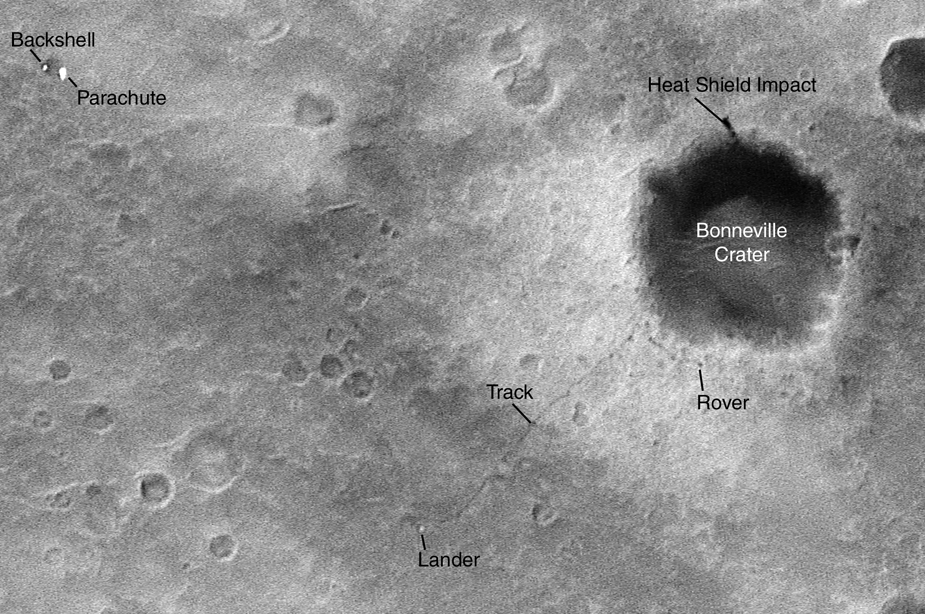 2004년 3월 30일: MGS는 화성 탐사 로봇 스피릿의 첫 85솔(sol, 화성의 하루 단위) 동안의 이동 경로를 보여주는 바퀴 자국과 함께 사진을 찍었다.