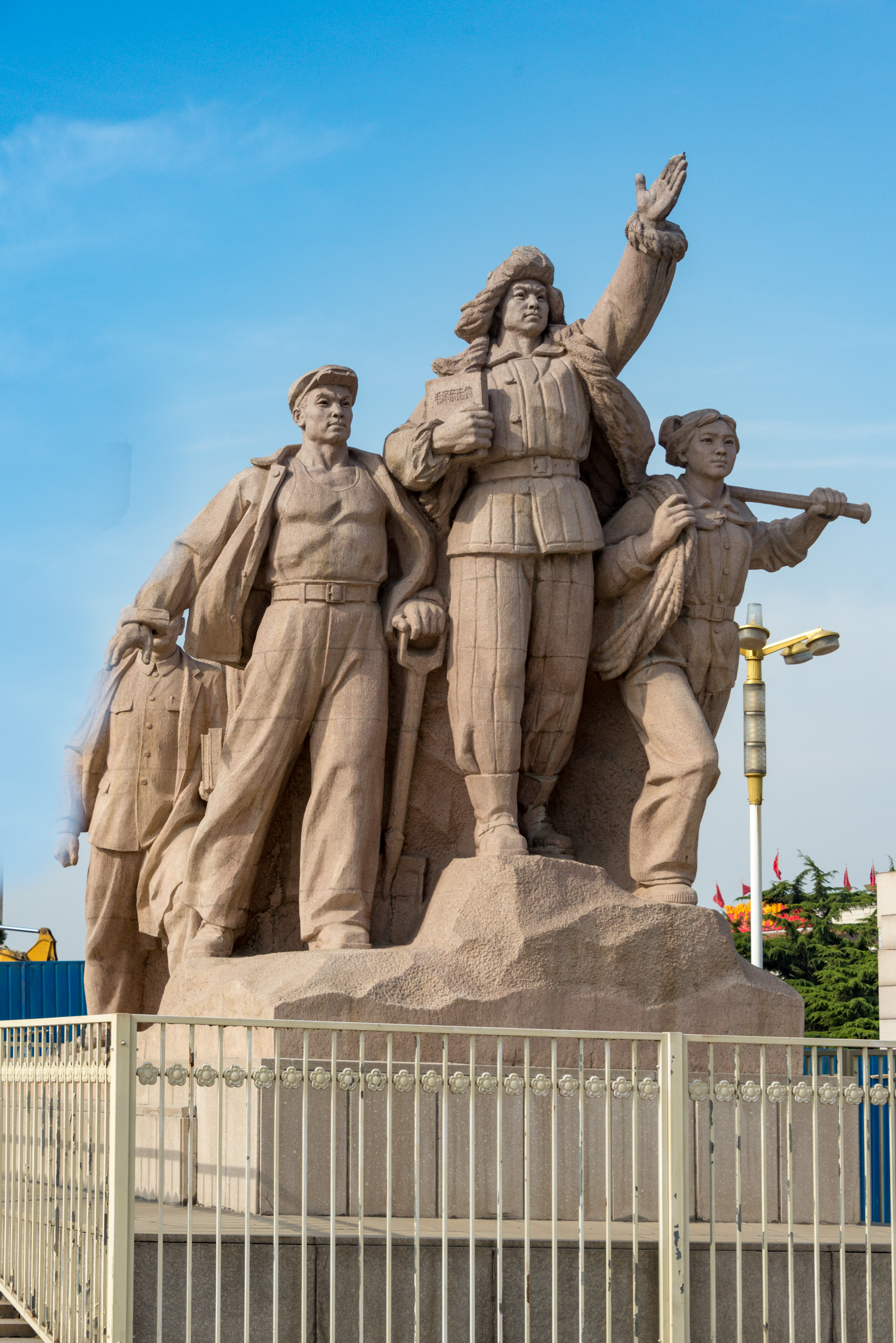 기념당 광장에는 4개의 조각 그룹이 있다.[22] 이 조각들은 점토로 만들어졌으며,[22] 북쪽 정문의 동쪽과 서쪽에 각각 하나씩, 남쪽 후문의 동쪽과 서쪽에 각각 하나씩 위치해 있다. 북쪽 정문 동쪽에 있는 조각은 민주 혁명을, 서쪽에 있는 조각은 사회주의 혁명과 산업 건설을 나타낸다. 남쪽 정문 양쪽에 있는 두 개의 조각상은 유지를 계승하고 혁명을 계속하는 것을 나타낸다.[23]