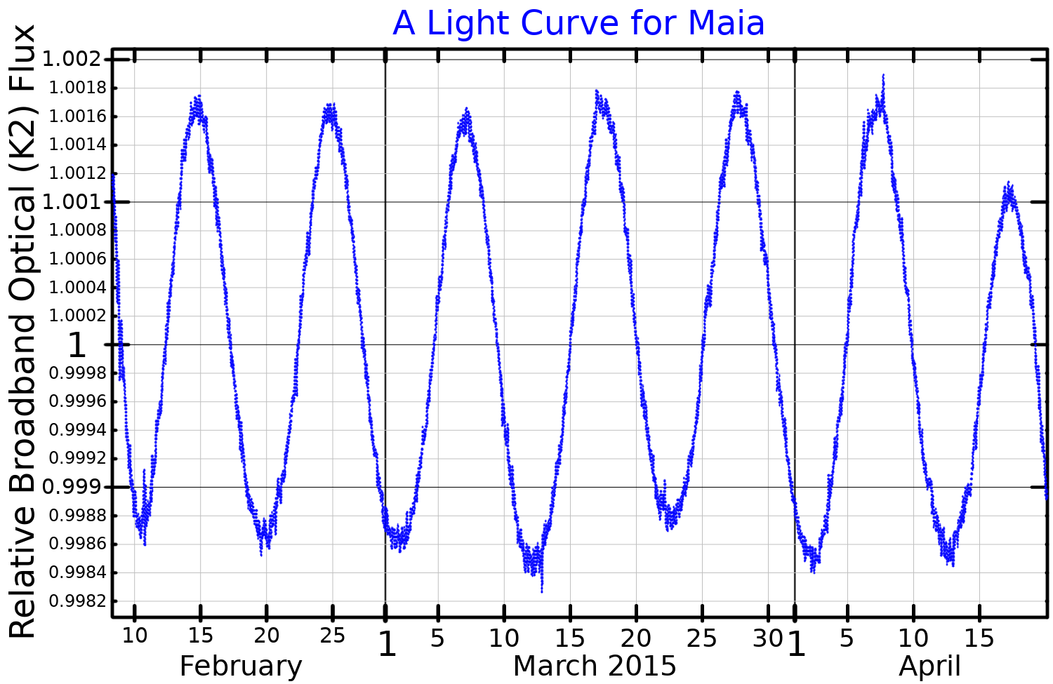 하지만 최근 케플러/K2 관측에서 마이아의 밝기에 10.3일 주기의 미세한 변동이 있음이 확인되었다. 이는 별점의 회전에 의한 것으로 추정된다.[23] 집중적인 연구에 따르면, 와 사이의 온도를 가진 별들 중 6.7%가 작은 진폭의 맥동을 보이지만, 다른 변광성 분류에는 속하지 않는 것으로 나타났다. 이들은 잠재적인 마이아 변광성으로 여겨진다.[24]