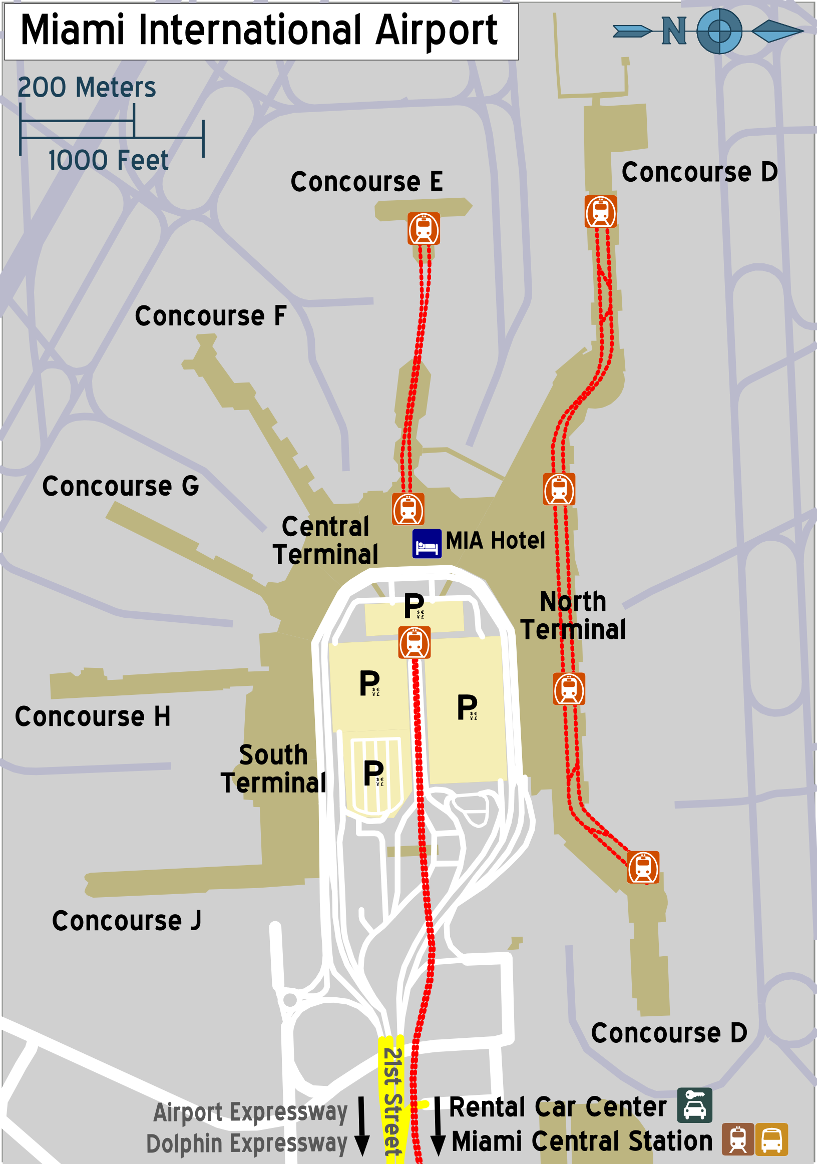 마이애미 국제공항의 터미널은 반원형으로 배치되어 있으며 주차장은 터미널 중앙에 위치하며, 위쪽에 있는 이동식 보도(무빙워크)로 터미널과 연결되어 있다.