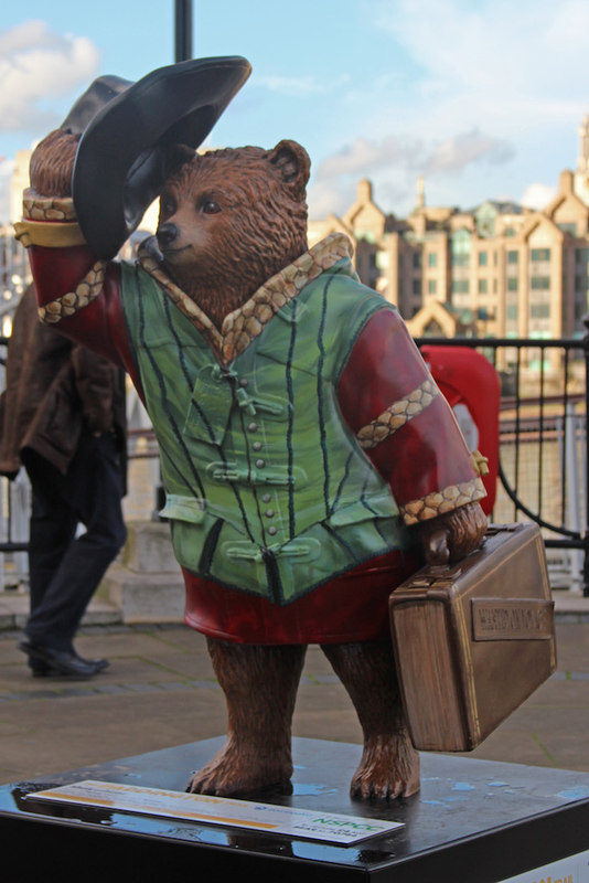 런던 셰익스피어 글로브 밖에 있는 셰익스피어 테마의 패딩턴 베어 동상. NSPCC 기금 마련을 위해 경매에 부쳐졌다.