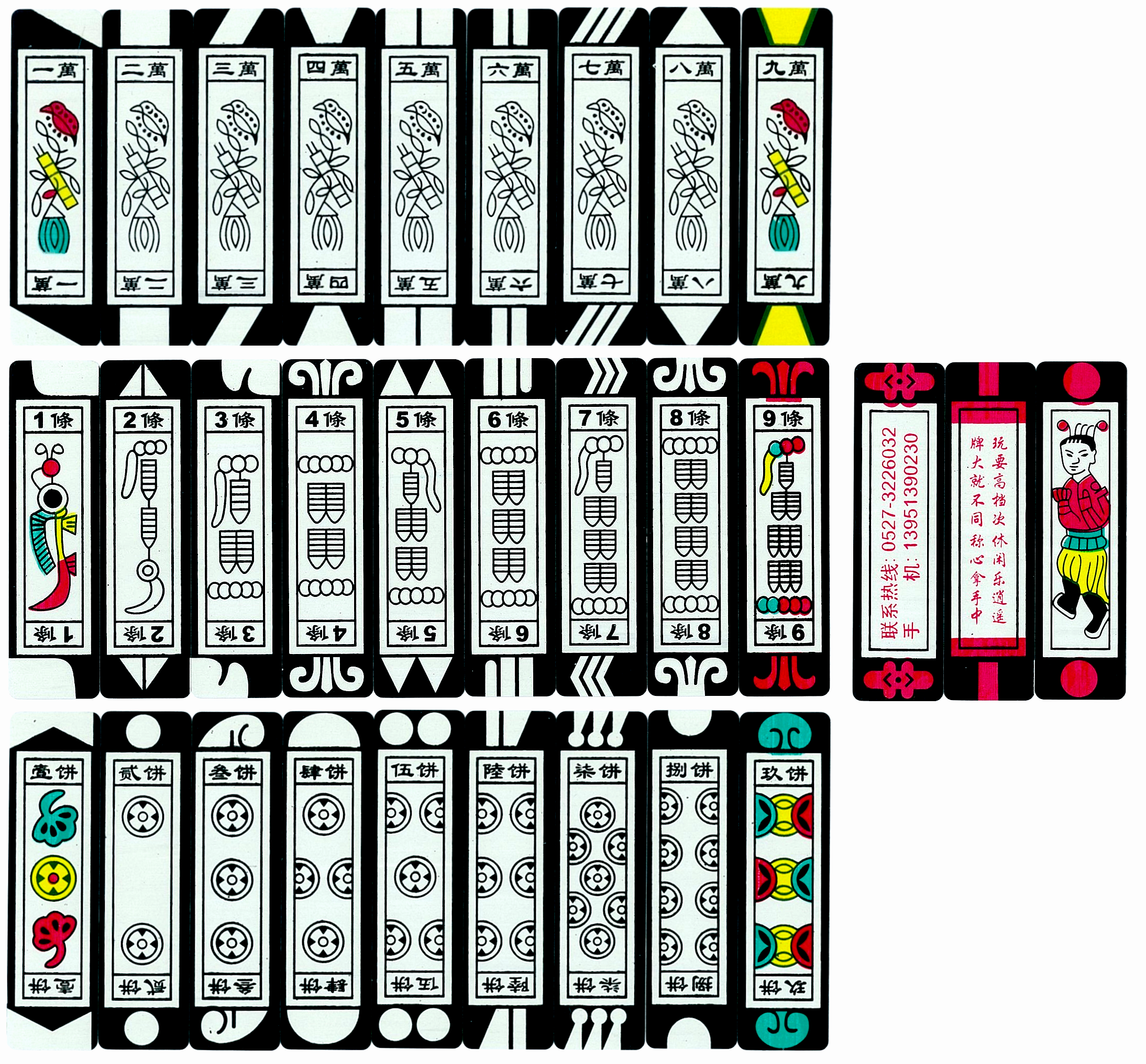발(Bamboo) 무늬는 '막대기', '줄'이라고도 한다. 첫 번째 패는 보통 하나의 대나무 대신 새(전통적으로 공작 또는 참새)가 그려져 있다. 삭(Dots) 무늬는 '바퀴', '원', '동전'이라고도 한다. 만(Characters) 무늬는 윗부분의 글자가 중국어 표기의 숫자이고, 아랫부분의 글자(번체)가 중국어로 '만(萬)' 자이기 때문에 '만'이라고도 한다.[8]