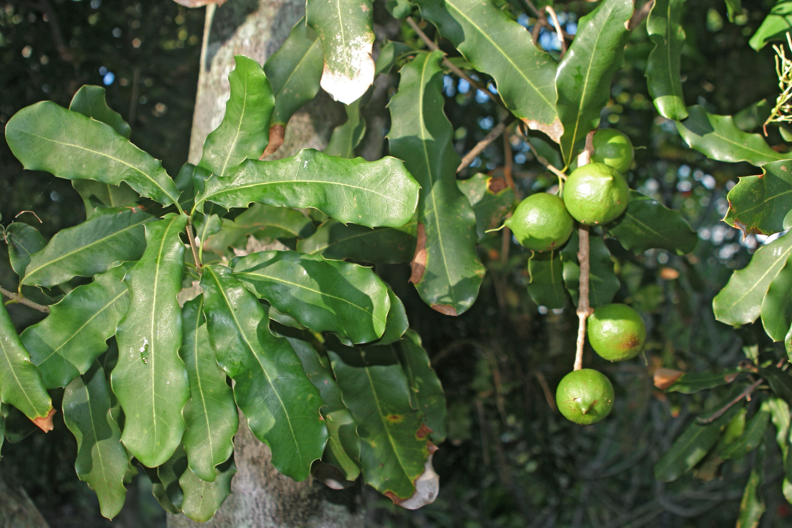 ''마카다미아 인테그리폴리아''(Macadamia integrifolia)는 호주 원산의 나무로, 호랑가시나무와 같은 잎을 가지고 있으며, 습하고 유기적인 토양에서 잘 자란다. 최저 -4.4°C의 온도도 견딜 수 있다.[1] 묘목은 5~7년 안에 열매를 맺는다.[1] 번식은 씨앗, 접목 또는 공중취목으로 한다.[1]