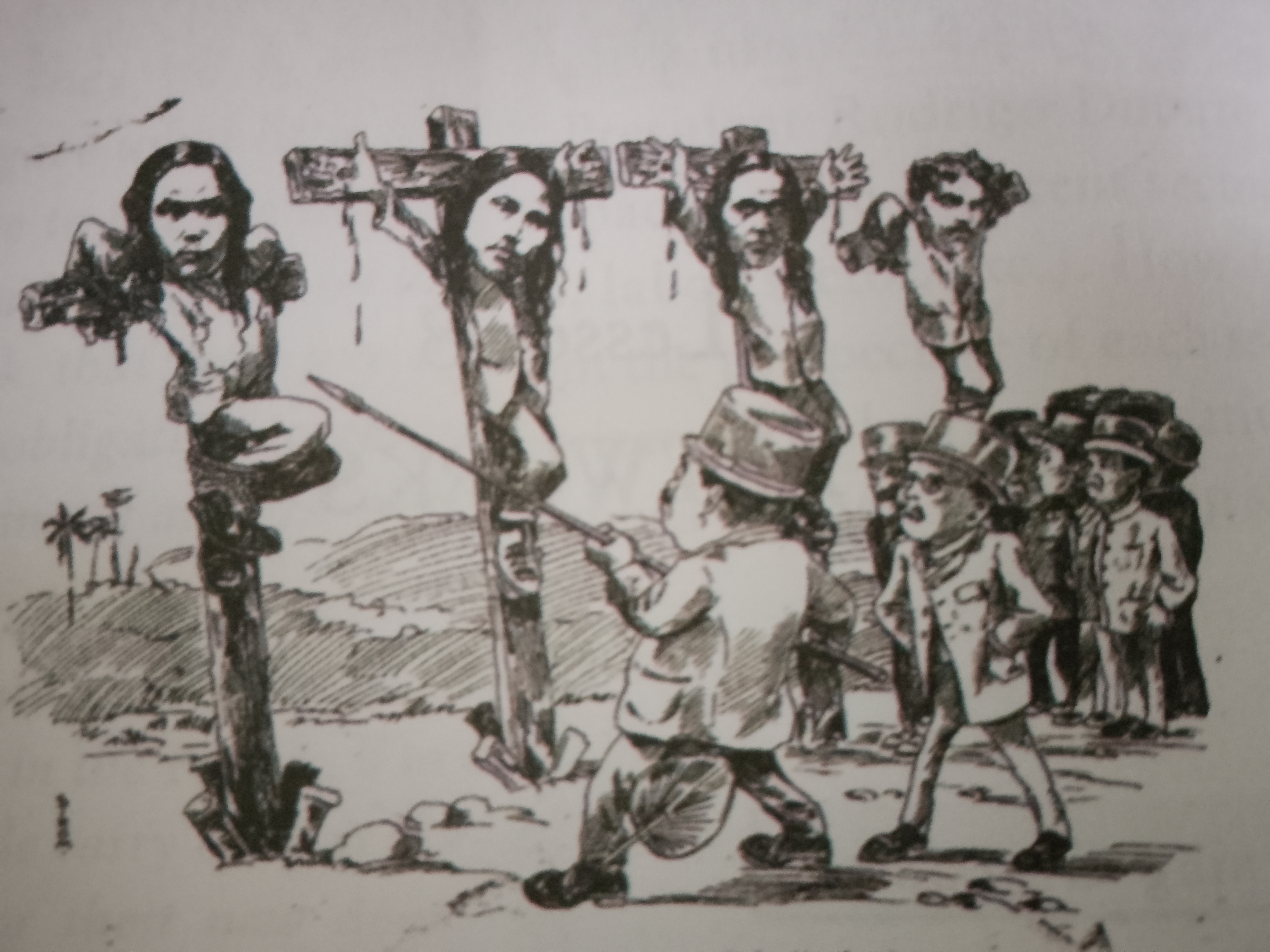 1907년 풍자 만화 리팡 칼라바우(Lipag-Kalabaw)는 도미나도르 고메즈를 로마 백부장 롱기누스로 묘사하며, 십자가에 매달린 자유 투사들 (왼쪽부터) 마카리오 사카이, 프란시스코 카레온, 훌리안 몬탈반, 루시오 데 베가에게 창의 마지막 일격을 가하고 있는데, 그들은 미국 정부에 의해 강도질 혐의로 사형 선고를 받았다.