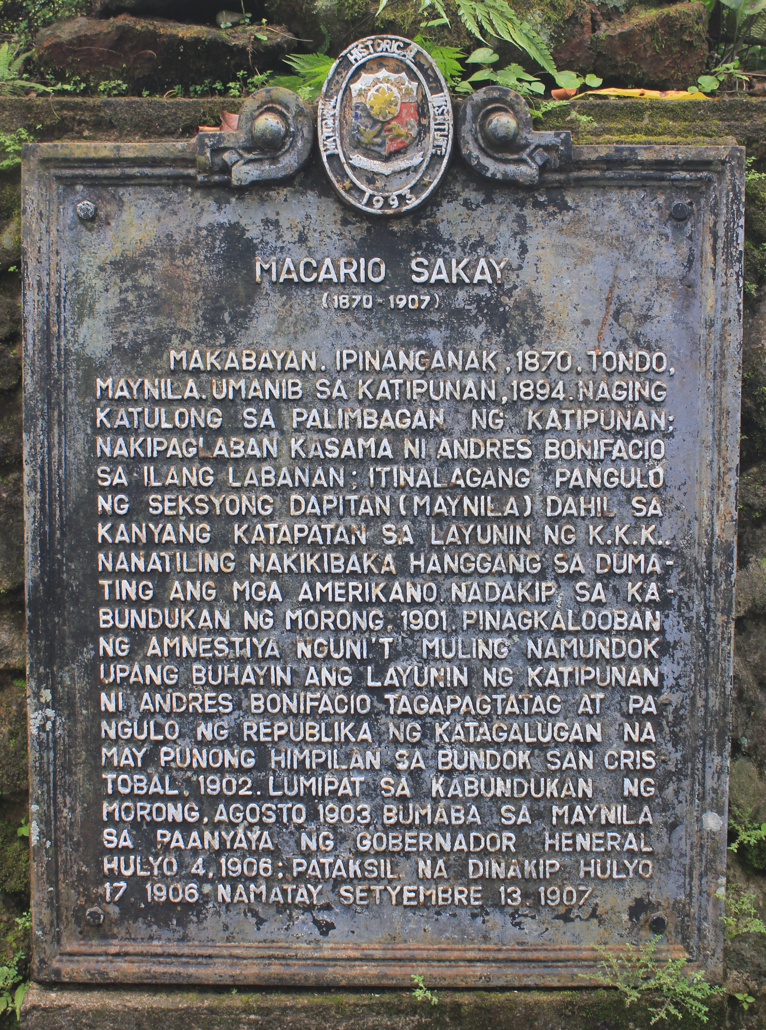 마카리오 사카이는 1878년 필리핀에서 태어난 인물로, 필리핀 혁명과 필리핀-미국 전쟁에서 활약했다. 그는 카티푸난의 창립 멤버이자 안드레스 보니파시오와 함께 스페인에 맞서 싸웠으며, 1902년 미구엘 말바르가 체포된 후 카티푸난의 새 지도자이자 타갈로그 공화국의 대통령으로 취임했다. 그는 미국에 저항하며 게릴라전을 이끌었으나 1906년에 체포되어 이듬해 처형되었다. 그는 1907년 교수형에 처해지기 전, 필리핀의 독립을 외치며 죽음을 맞이했다. 그의 업적을 기리기 위해 동상이 세워지고, 군 기지의 이름이 변경되었다.