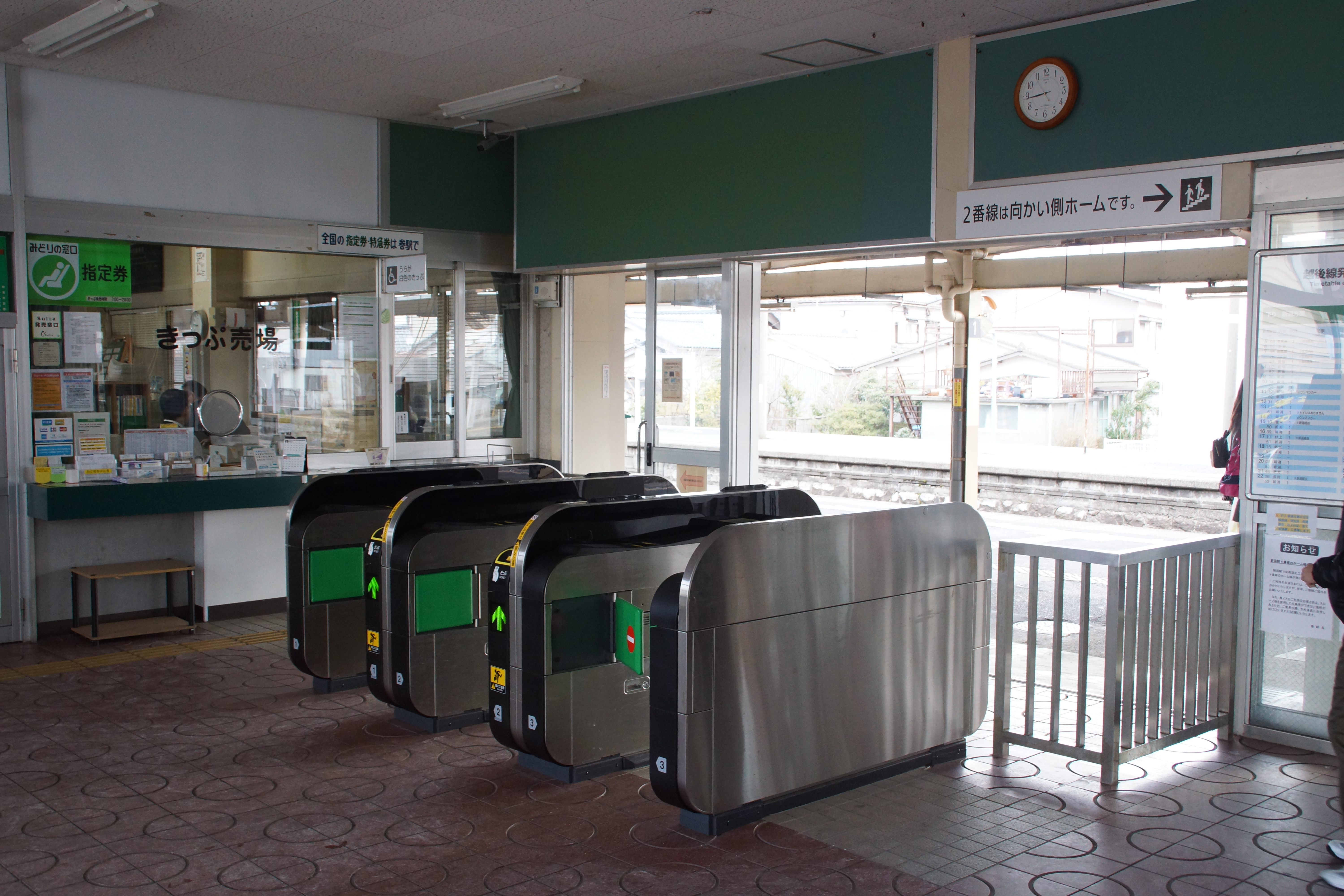 역에는 미도리노 마도구치 매표소와 자동 개찰기가 설치되어 있으며, Suica 교통카드를 사용할 수 있다. 2013년까지는 직영역이었으나, 이후 JR 동일본 니가타 시티 크리에이트(JENIC)가 수탁하는 업무 위탁역으로 변경되었다. 역사 노후화로 인해 교상역사로의 개축이 검토되고 있으며, 2023년에는 동서 자유 통로 기본 설계에 관한 협정이 체결되었다.[12]