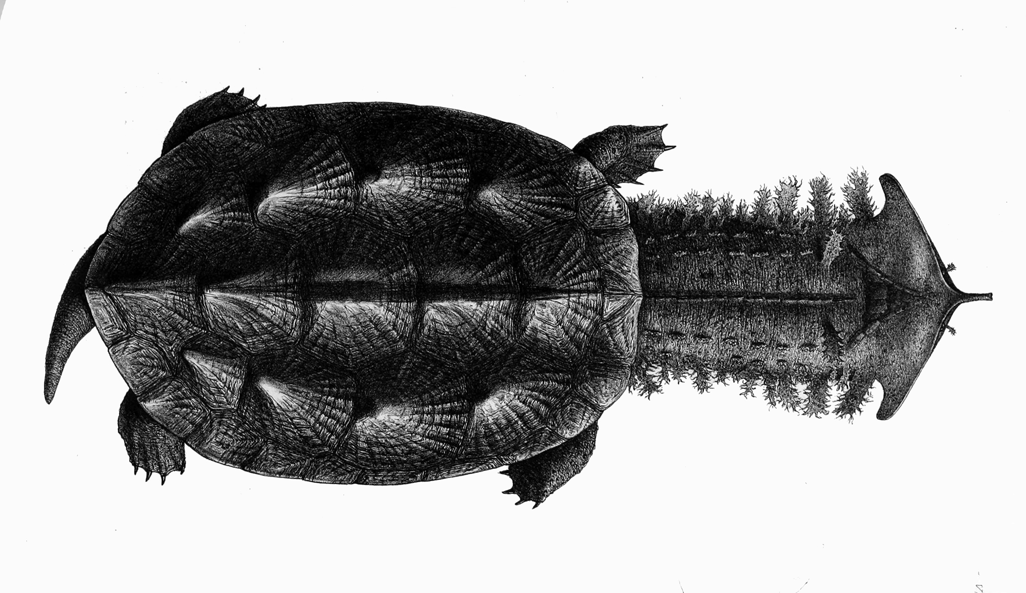최대 갑장은 44.9cm이다.[27] 등갑에는 갑판마다 줄무늬 모양의 융기(키르)가 파선 모양으로 발달하며, 특히 추갑판이나 늑갑판의 부화 직후부터 있는 갑판(초생갑판) 주변이 현저하게 융기한다.[27] 머리는 매우 편평하고 넓으며,[27] 주둥이는 돌출되어 있다.[27] 눈은 작다.[27]