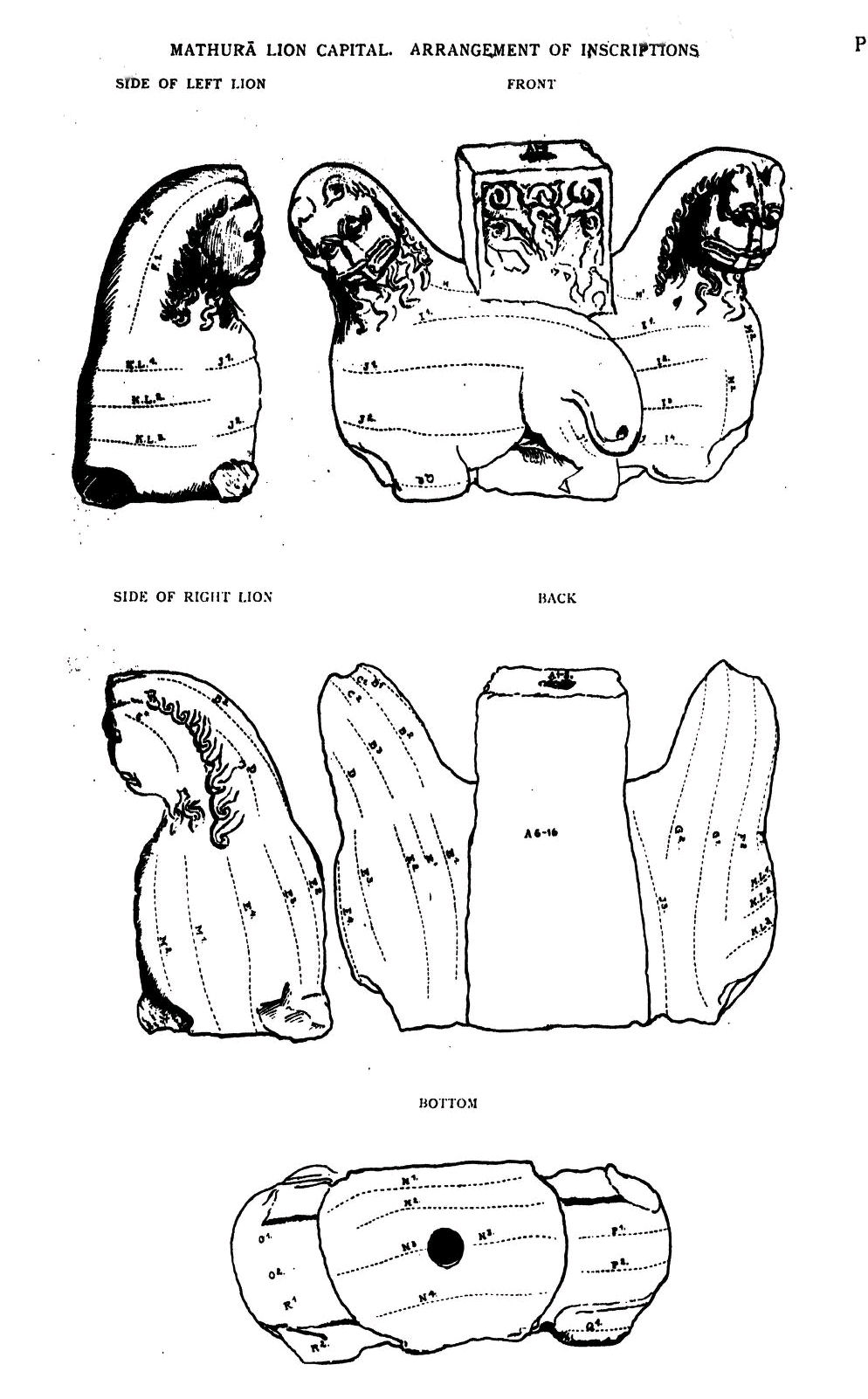 마투라 사자 기둥머리의 명문은 카로슈티 문자로 새겨져 있으며, 인도-스키타이 지배자들의 종교적 헌신과 관련된 내용을 담고 있다.[6][7][8][9][10]