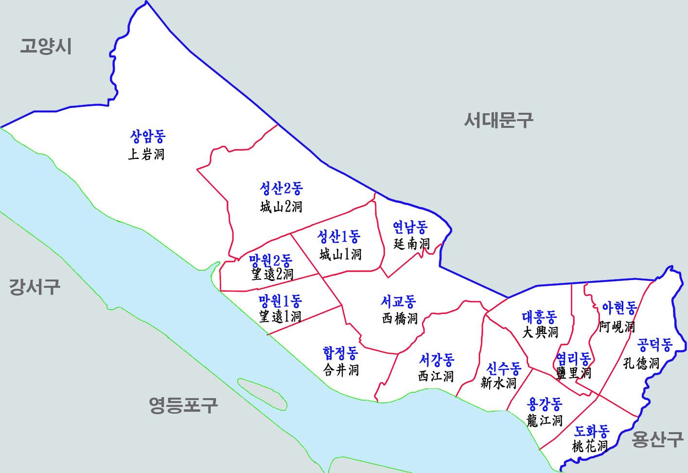 서강동 | 창전동, 상수동, 하중동, 신정동, 당인동 |