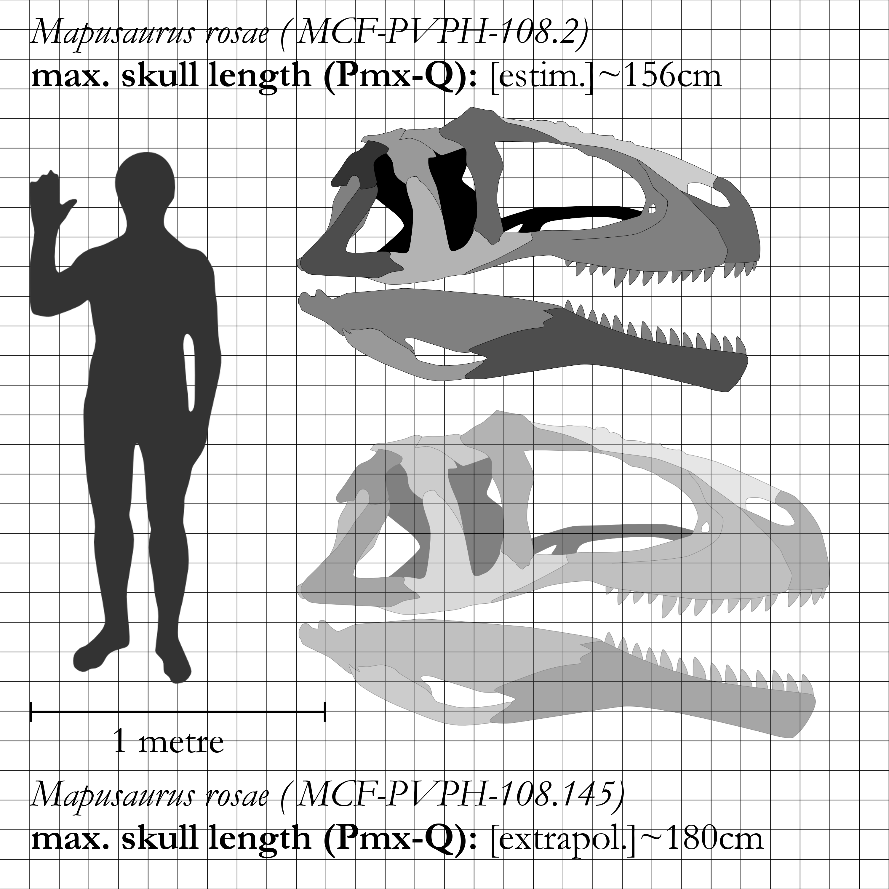 ''마푸사우루스''는 대형 수각류였지만, 가장 가까운 친척인 ''기가노토사우루스''보다는 약간 작았다. 가장 큰 표본은 길이가 약 10.2m에서 12.2m이고 무게는 최대 3MT에서 6MT로 측정되었다.[6][7][8][9]