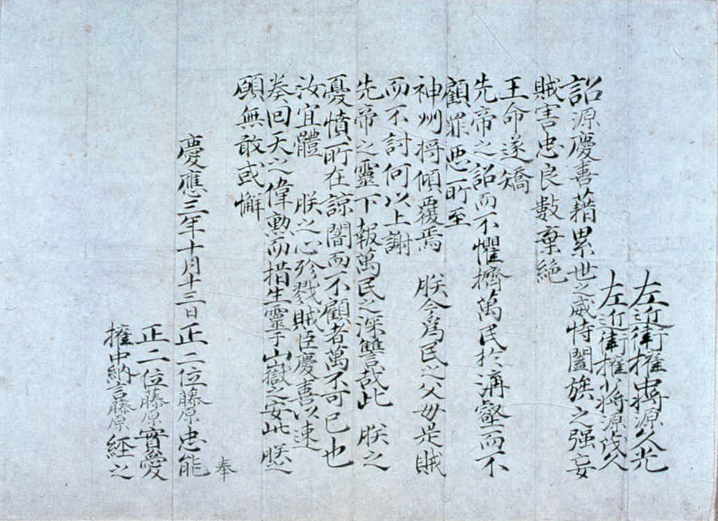 1868년 1월 3일(게이오 3년 12월 9일)에, '''왕정복고의 대호령'''이 발표되어, 케이키의 쇼군직 사직을 칙허하고, 막부·섭정·관백 등이 폐지되어, 천황 친정을 기본으로 하여, 총재·의정·참여 등으로 구성되는 신정부 수립이 발표되었다.[84]