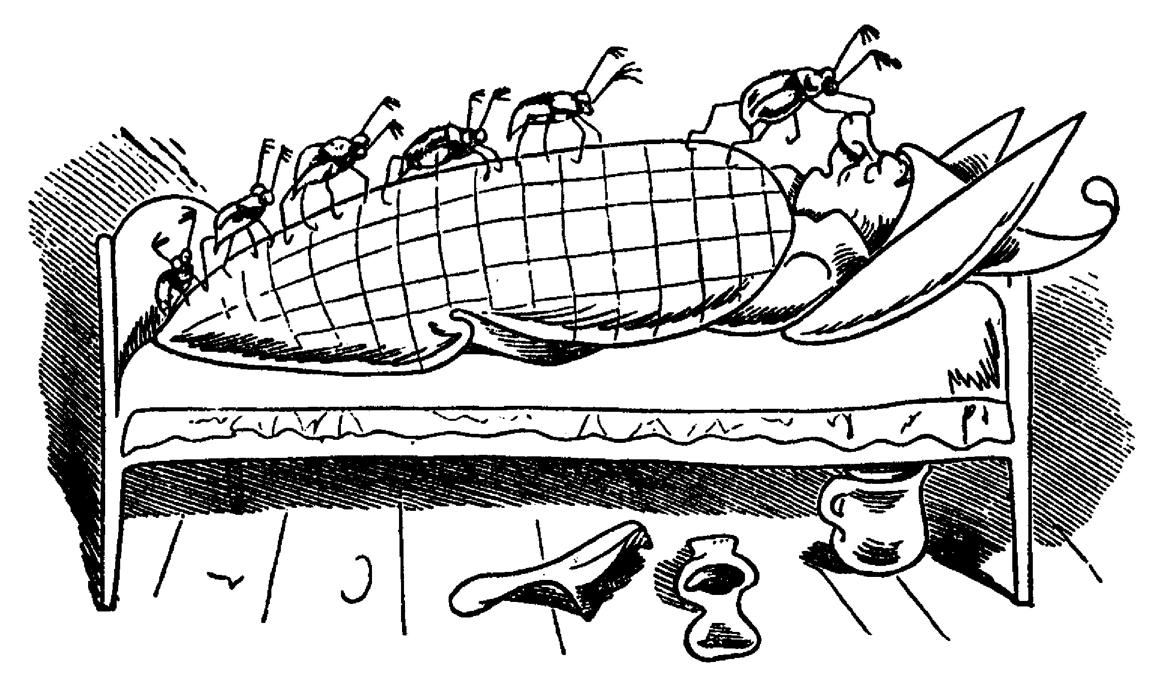 막스와 모리츠는 자루 가득 풍뎅이를 모아 삼촌 프리츠의 침대에 몰래 숨겨둔다. 잠들려던 삼촌은 코 위에 풍뎅이가 기어 다니는 것을 알아차린다. 소름이 돋은 삼촌은 필사적으로 신발로 풍뎅이를 모조리 때려잡는다.