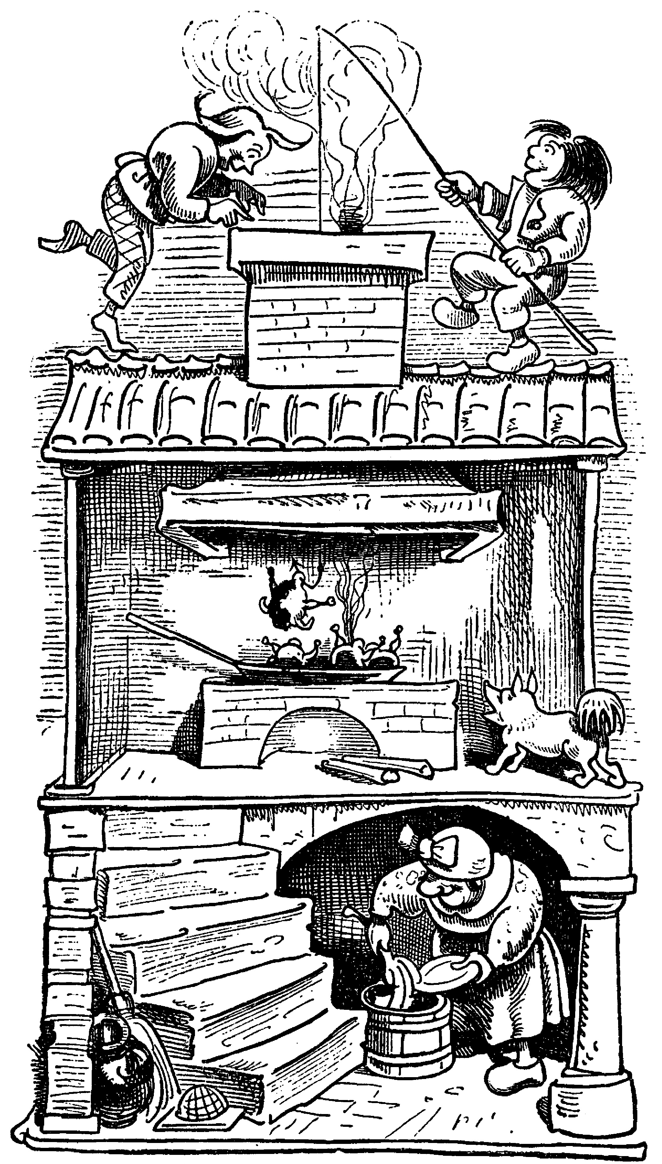 과부가 죽은 닭을 통구이로 만들자, 막스와 모리츠는 과부의 집 지붕으로 잠입한다. 과부가 부엌을 떠난 틈을 타, 두 사람은 낚싯대로 굴뚝을 통해 통구이를 훔쳐낸다. 기르던 개의 짖는 소리를 듣고 부엌으로 달려온 과부는 아궁이가 비어있는 것을 알아차리고, 기르던 개에게 벌을 준다.2. 3. 세 번째 장난: 재봉사 뵉