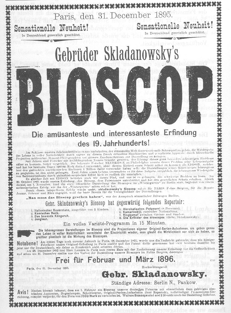 스클라다노프스키 형제는 1895년 5월에 여러 편의 영화를 촬영했다. 첫 번째 영화는 에밀이 베를린 파노라마를 배경으로 지붕 위에서 과장된 동작을 연기하는 모습을 담았는데, 이는 상업적인 상영에 사용되지 않은 실험적인 테스트였다. 형제는 도시에서 공연하는 다양한 연예인들을 촬영하여 극장 정원에서 햇빛 아래에서 공연하게 했고,[1] 중립적인 배경(보통 흰색, 때로는 검은색)을 사용하여 촬영했다.1895년 7월, 가스하우스 셀로에서 시사회가 열렸고, 초청된 친구와 동료들이 참석했다. 빈터가르텐 뮤직홀 감독들은 바이오스코프 상영을 본 후 깊은 인상을 받아 9월에 스클라다노프스키 형제와 2500 골드마르크를 지불하는 계약을 맺었다.[2] 1895년 11월 1일부터 그 달 말까지 영화 쇼를 제공했으며, 결국 23번 상영되었다. 약 15분 길이의 영화 쇼는 3시간 이상 지속되는 저녁 프로그램의 일부였다. 프로그램 광고에서 바이오스코프는 "새로운! 현대 시대의 가장 흥미로운 발명품"이라는 문구와 함께 특별히 굵은 글씨체로 중앙에 나타났다.[2] 스클라다노프스키 형제는 99프레임에서 174프레임(16fps로 재생 시 약 6초에서 11초) 길이의 영화 8편을 반복 상영했으며, 기계 소리를 덮기 위해 특별히 작곡된 악보를 매우 크게 연주했다. 인기 공연장은 매일 저녁 프로그램마다 약 1500명의 부유한 후원자들로 가득 찼지만, 모두가 영화를 본 것은 아니었다. 리뷰는 세 마리의 코끼리를 선호했지만, 바이오스코프는 큰 박수와 스크린에 던져지는 꽃과 함께 좋은 평가를 받았다.[1]