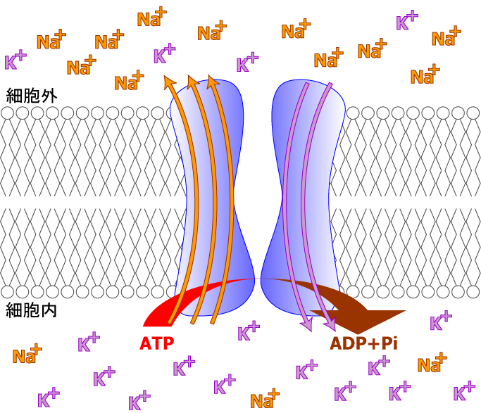 나트륨-칼륨 펌프는 세 개의 나트륨 이온을 세포 밖으로, 두 개의 칼륨 이온을 안으로 수송한다.[13][14] 그 결과, 뉴런 내부의 칼륨 이온(K+) 농도는 외부 농도보다 약 30배 더 크며, 외부의 나트륨 농도는 내부보다 약 5배 더 크다.[14][15][16]