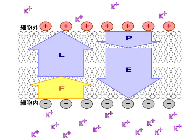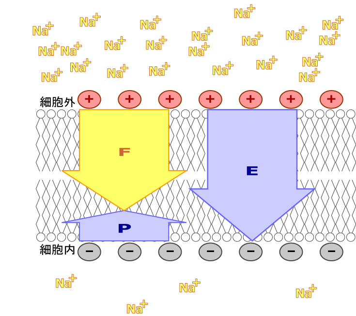 막 전위는 이온의 전하에 따라 이온의 이동에 영향을 준다. 안정 상태의 막 전위에서 세포 내부는 외부에 비해 음전하를 띠기 때문에, 양이온은 세포 내부로 들어오기 쉽고 음이온은 들어오기 어렵다. 반대로, 양전하를 띤 세포 외부로 음이온은 나가기 쉽고 양이온은 나가기 어렵다. 이는 세포 외부의 양전하가 양이온을 밀어내기 때문이다. 염화물 이온(Cl-)은 세포막을 비교적 자유롭게 통과하기 때문에, 막 전위에 의한 이동에 크게 의존한다.[60]3. 전기화학적 모형