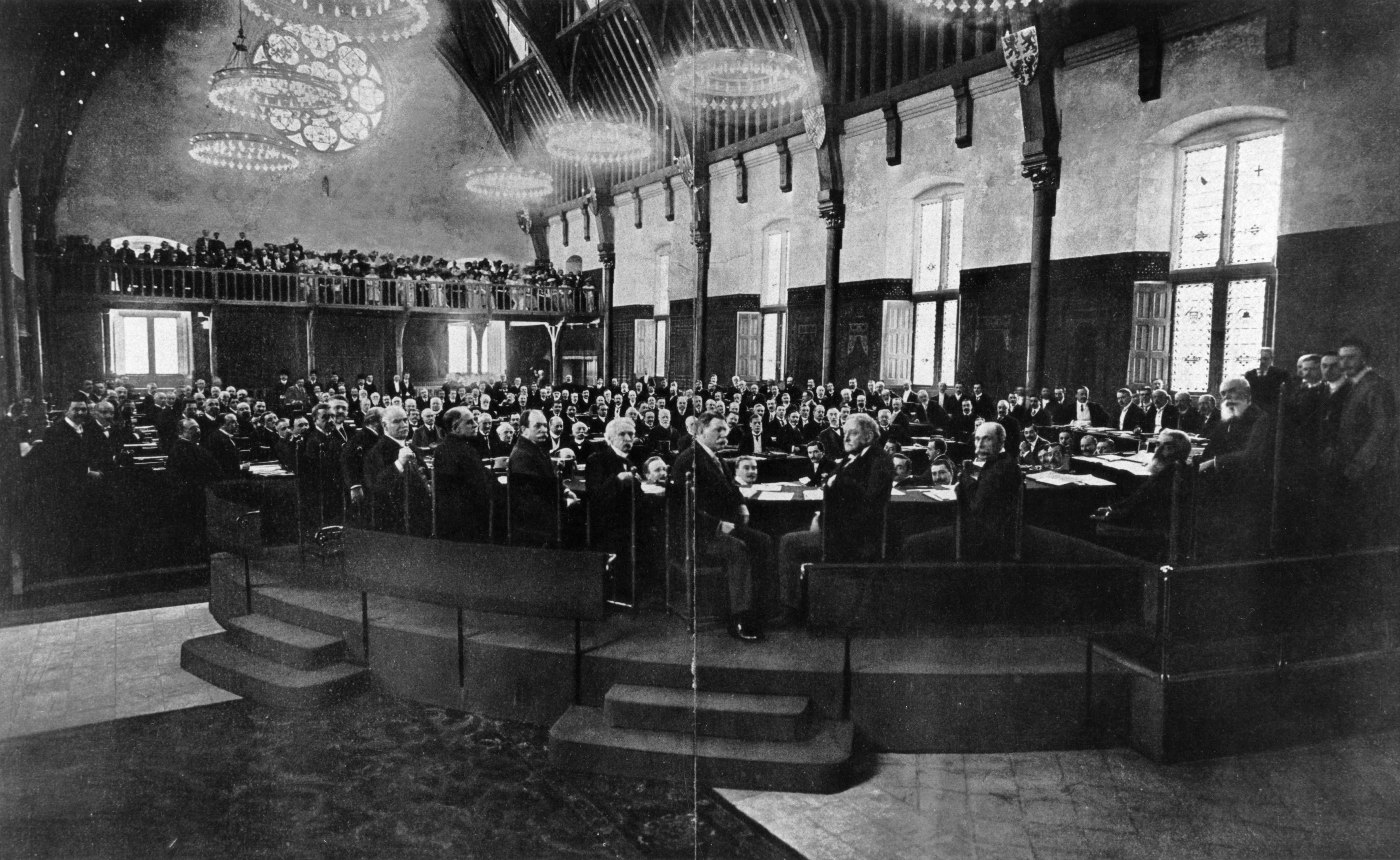 1899년 러시아의 차르 니콜라스 2세가 평화 회의를 제안하여[8] 26개국이 참가한 가운데 1차 회의가 개최되었다. 유럽 외에도 일본과 청 등이 참가하였다.1차 회의 주요 참가국과 대표는 다음과 같다.