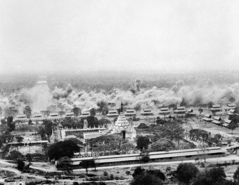 제2차 세계 대전 중 공습으로 파괴되는 만달레 왕궁(당시 포트 더퍼린)
