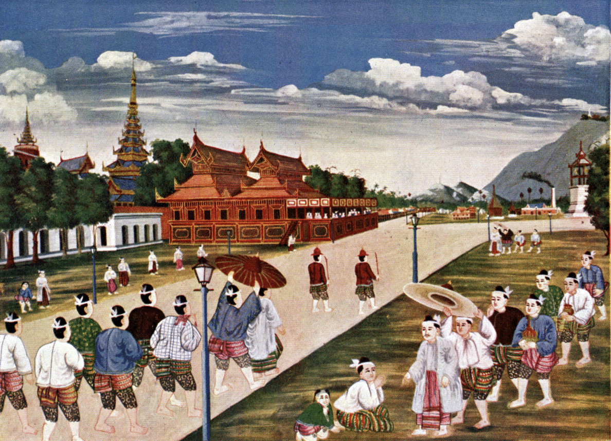꼰바웅 왕조 시대의 만달레 왕궁 정원을 그린 전통적인 버마 그림