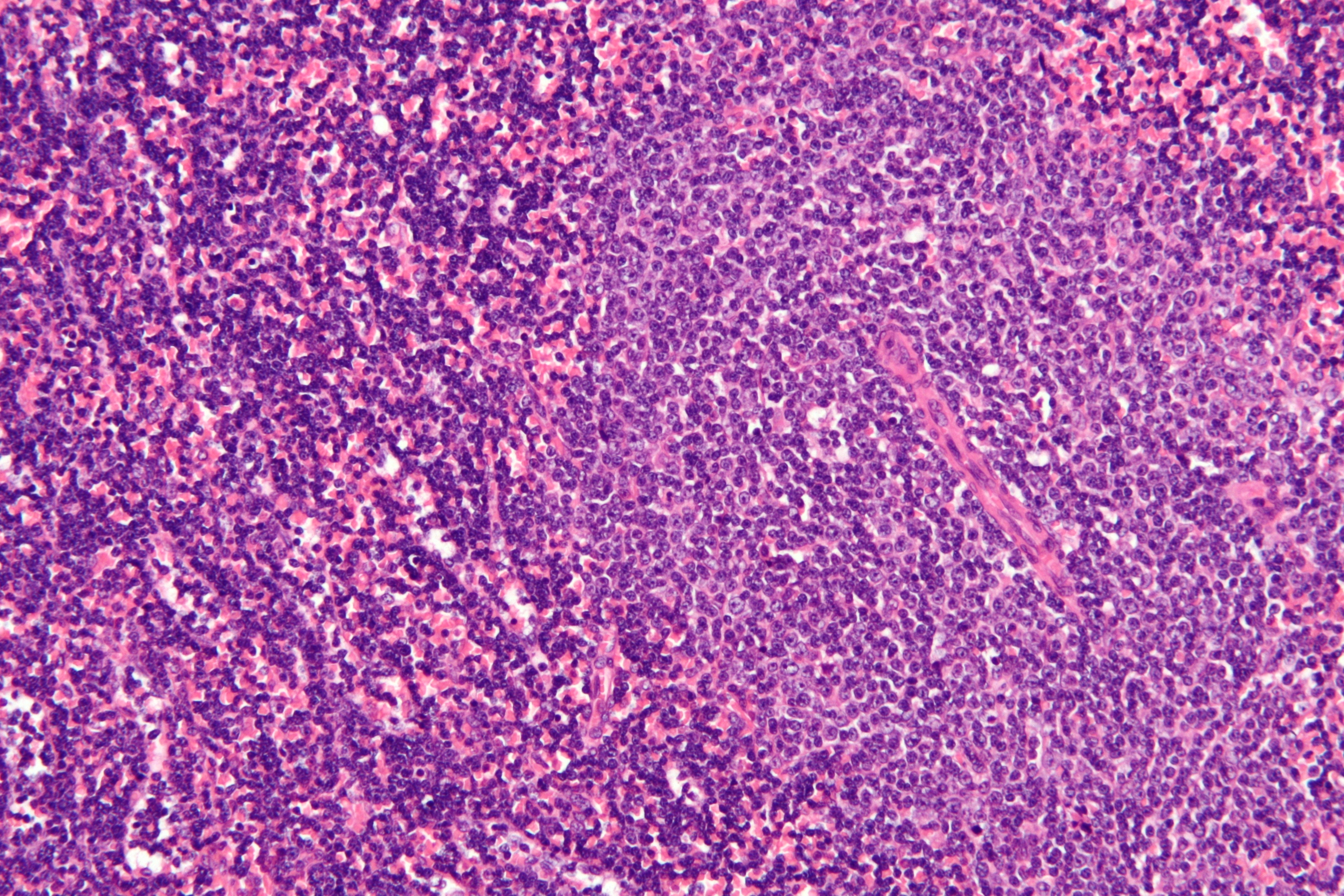 현미경 사진으로 만성 림프구성 백혈병(B-CLL)의 영향을 받은 림프절을 보여준다. 특징적인 증식 중심(이미지 오른쪽)은 더 크고 밝게 염색된 세포로 구성되어 있다. (H&E 염색)
