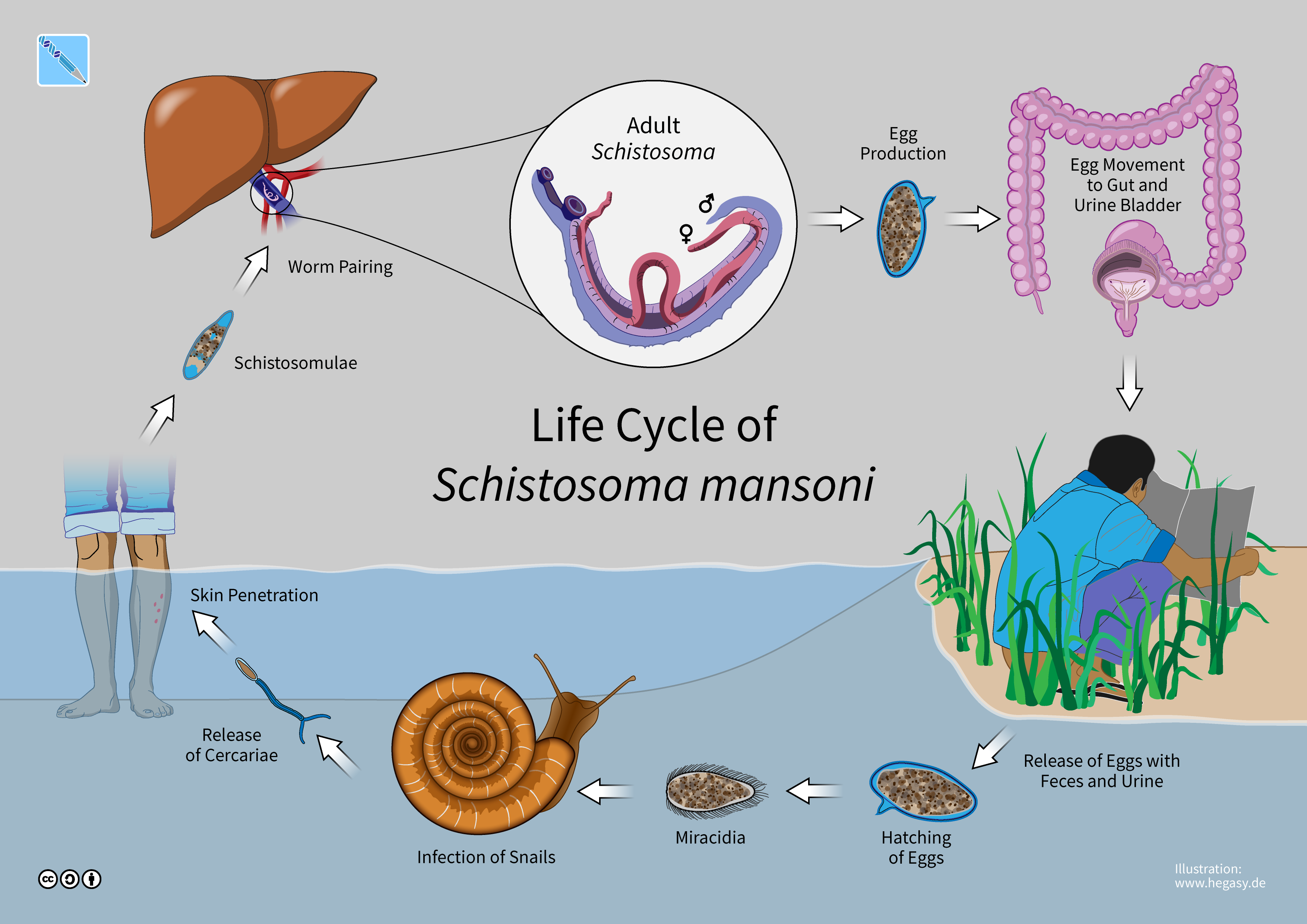 충란은 분변과 함께 배출되어, 물속에서 성숙한 유미유충이 부화한다. 물달팽이과 ''Biomphalaria''속에 속하는 달팽이를 중간 숙주로 삼고 있으며, 유미유충은 이 달팽이를 만나면 체표에서 조직 내로 침입하여, 포자낭으로 변태한다. 모포자낭, 딸포자낭 2세대를 거친 후, 수천 개의 유미유충이 생성된다. 베네수엘라에서는 아프리카 왕달팽이도 중간 숙주가 될 수 있다고 보고되었다.
