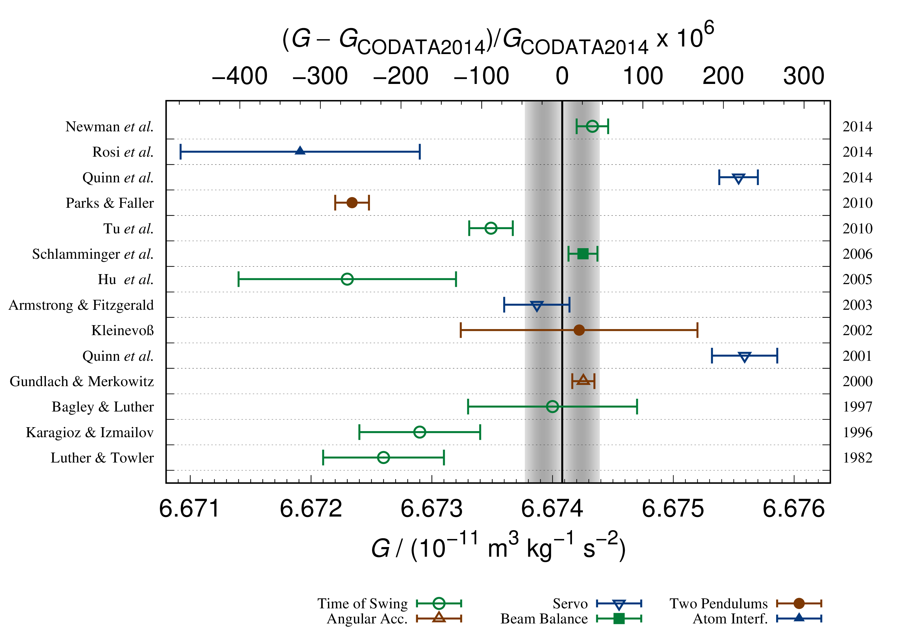 SI 단위계에서, 만유인력 상수 ''G''의 현대적인 값은 약 6.67259 × 10⁻¹¹ m³⋅s⁻²⋅kg⁻¹이다.