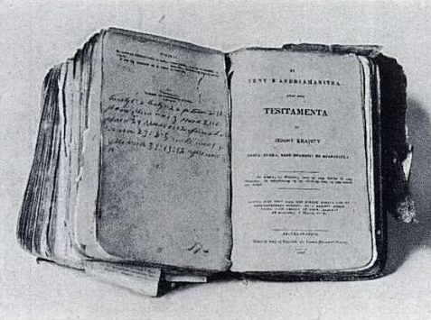 에티엔 드 플라쿠르는 최초로 종교 텍스트의 이중 언어 번역을 하였고,[26] 이 언어의 최초 사전 또한 출판했다.[27] 메리나 왕조의 라다마 1세는 아랍-말라가시 전통에 정통했지만,[28] 1823년에 데이비드 존스가 만든 라틴 문자 시스템을 선택하고 런던 선교회가 학교와 교회를 설립하도록 초청했다. 1835년, 성경이 라틴 문자를 사용하여 마다가스카르 고지대에서 일하는 영국 프로테스탄트 선교사들에 의해 말라가시어로 번역 및 인쇄되었다.[29]
