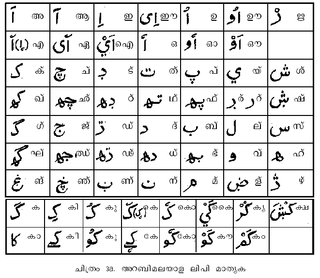 말라얄람어는 라틴, 수리아니,[99][100][101] 아랍 문자 등 다른 문자로도 표기되어 왔다. 수리아니 말라얄람은 19세기까지 성 토마스 그리스도인(나스라니)[99][100][101]들이 사용했다. 아랍 문자는 특히 케랄라와 락샤드위프 제도의 마드라사에서 가르쳐졌다.[102][103]