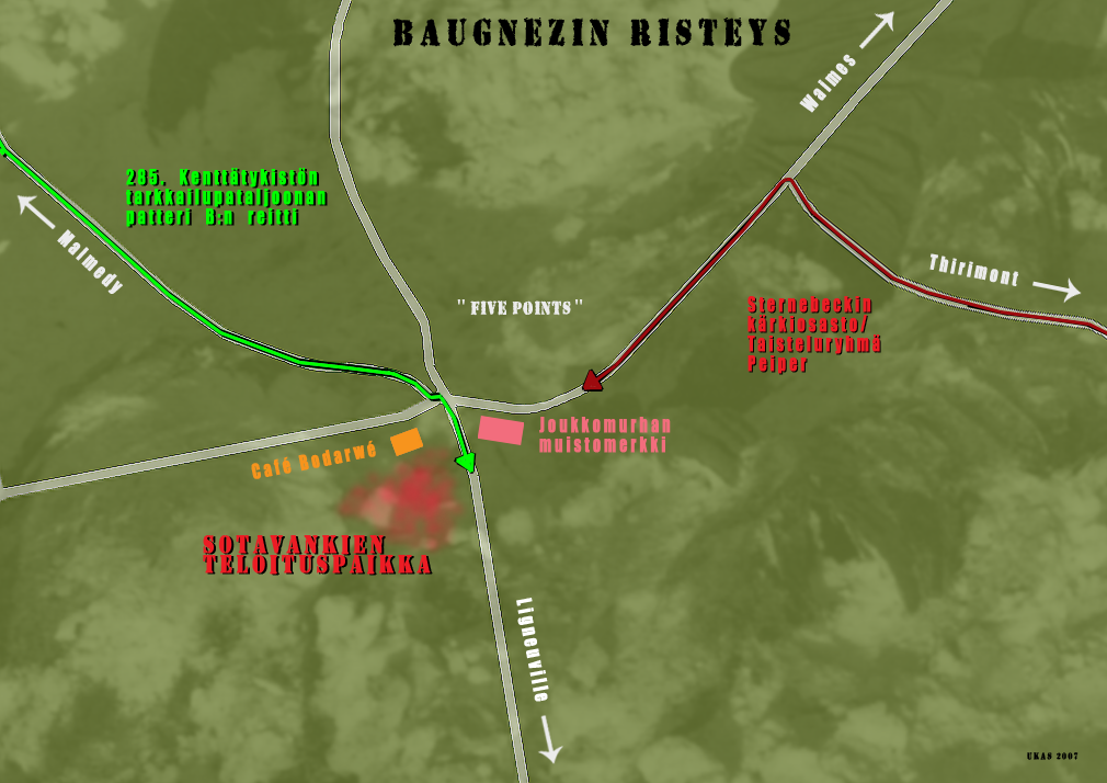 짧은 전투 후, Kampfgruppe Peiperde 수송대의 전차와 장갑차는 서쪽 리뉴빌(Ligneuville)로 계속 이동했다. 보뉴(Baugnez) 삼거리에서 Waffen-SSde 보병들은 항복한 미군 포로들을 농부의 들판에 모아 그날 이전에 포로로 잡은 다른 미군 포로들과 합쳤다.