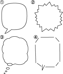 일반적인 대화는 주로 타원형 말풍선(그림 1)으로 표현되며, 꼬리라고 불리는 뾰족한 부분이 말하는 사람을 가리킨다. 큰 소리나 힘찬 인상은 삐죽삐죽한 외곽선(그림 2)으로, 작은 소리나 갈라진 목소리는 점선이나 작은 크기로 표현된다.