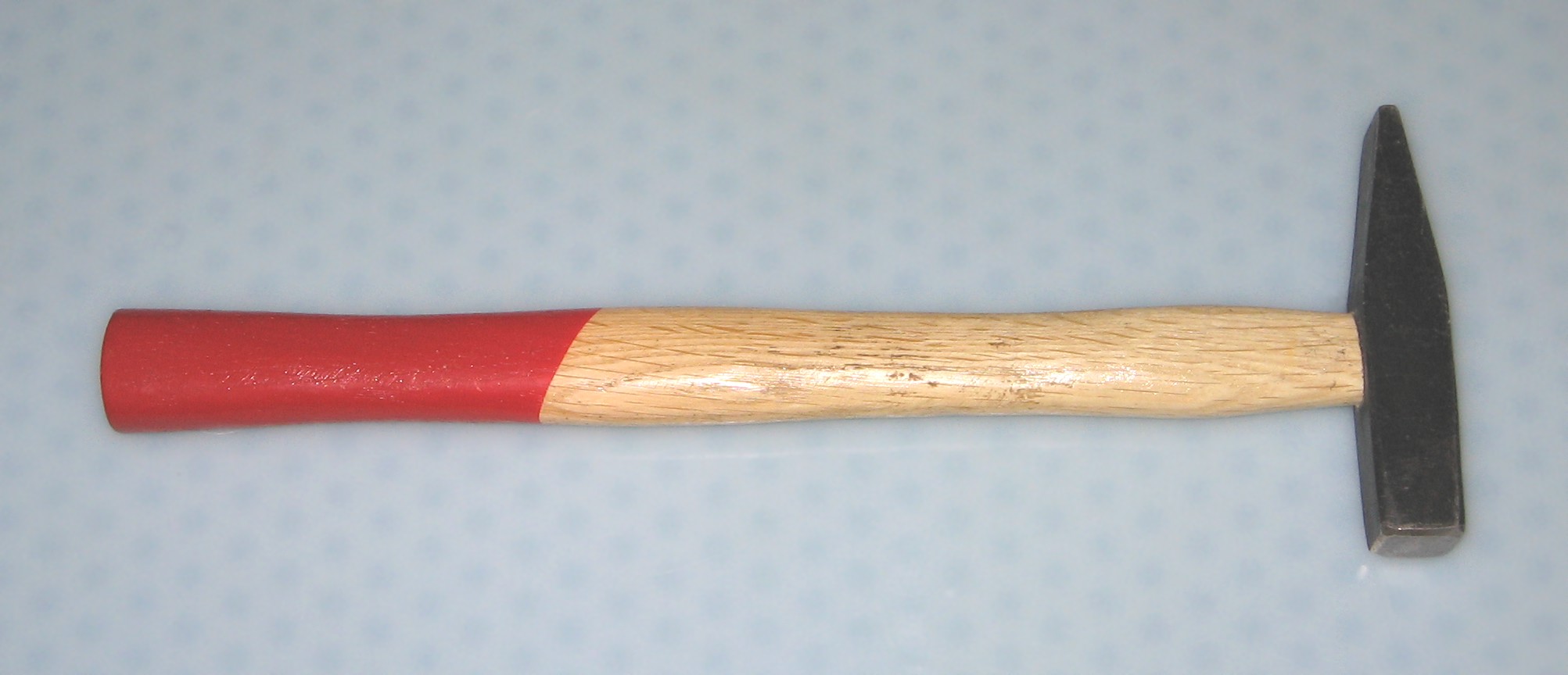 - 한손 해머(철공 해머·볼핀 해머, ball peen hammer): 한쪽이 평평(평두)하고, 반대쪽이 구형(원두)인 금속 가공용이다. 평두도 100R의 곡면으로 되어 있다. 크기는 머리 부분의 무게에 따라 달라지며, 파운드 단위(1/4, 1/2, 3/4, 1, 3…파운드)로 표시하고, 미터법 보급 후에는 파운드를 생략하고 번호로 부른다. 1번(1파운드 해머)이 표준 크기이다. 철강 재료를 단련하거나, 리벳을 박는 데 사용되며, 원두는 강판에 곡면을 만들 수 있다.[23]