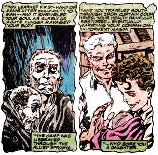 매그니토는 1920년대 후반, 독일계 유대인 중산층 가정에서 "막스 아이젠하르트"라는 이름으로 태어났다. 막스의 아버지 야콥 아이젠하르트는 제1차 세계 대전 참전 용사였다.[1] 나치의 집권과 1935년 뉘른베르크법 통과, 크리스탈의 밤을 겪으며 막스와 그의 가족은 폴란드로 도피했다. 그곳에서 독일의 폴란드 침공 당시 체포되어 바르샤바 게토로 보내졌다.[1][27] 막스와 그의 가족은 게토에서 탈출했지만, 배신당해 다시 체포되었다. 그의 어머니, 아버지, 누이는 처형되었지만, 막스는 돌연변이 능력이 발현되면서 살아남았다. 집단 매장지에서 탈출한 그는 결국 다시 체포[28]되어 아우슈비츠로 보내졌고, 그곳에서 ''존더코만도''가 되었다.[28][29][30] 아우슈비츠에서 아이젠하르트는 어렸을 때 사랑했던 로마 소녀 마그다와 재회했고, 1944년 10월 7일 봉기 동안 강제 수용소에서 탈출했다.